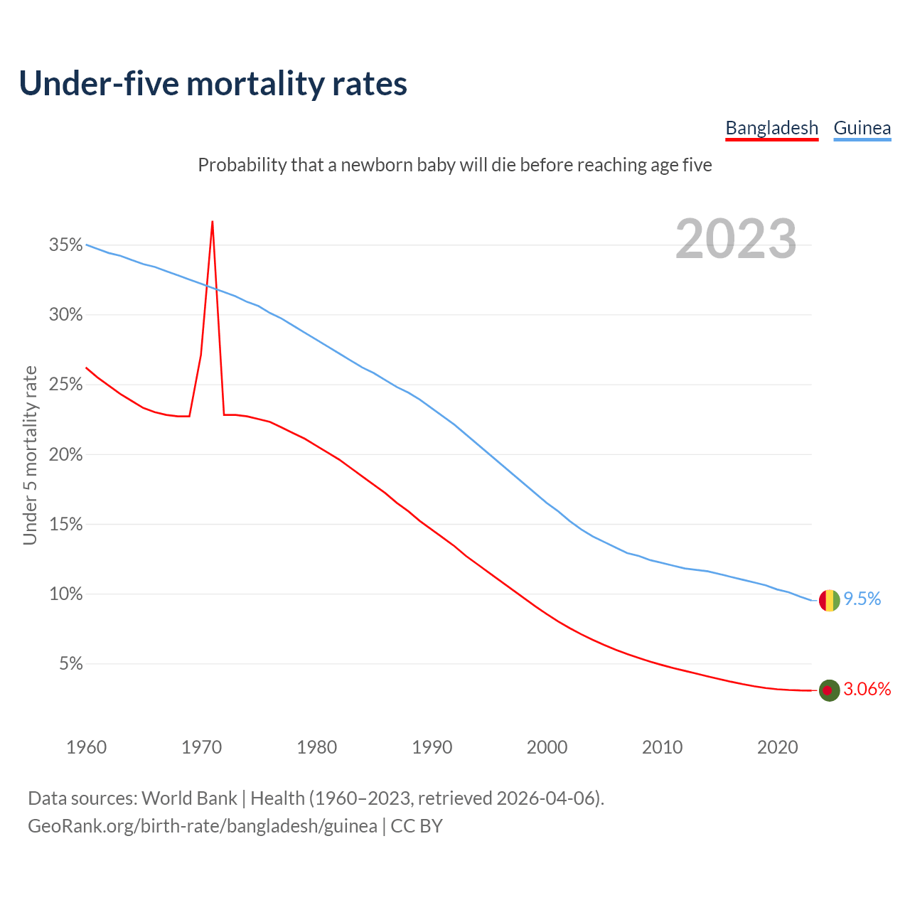 The chance that a newborn baby will die before reaching age five is 3.06% in Bangladesh and 9.5% in Guinea. Above is a chart with historical data on under-five mortality rates.