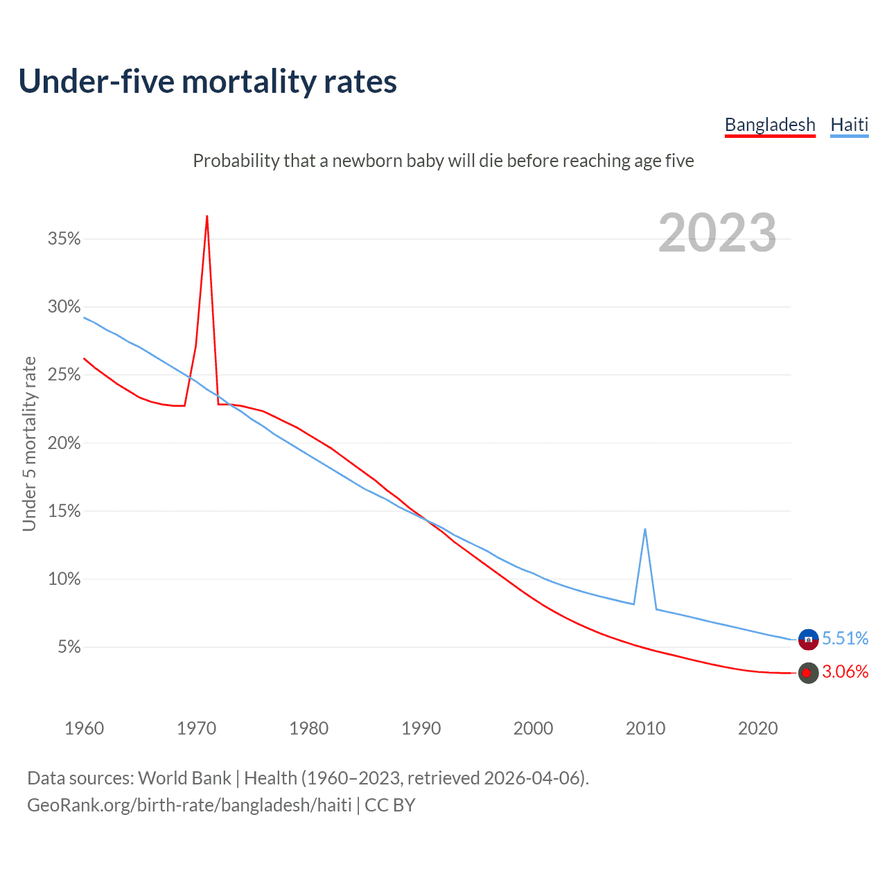 The chance that a newborn baby will die before reaching age five is 3.06% in Bangladesh and 5.51% in Haiti. Above is a chart with historical data on under-five mortality rates.