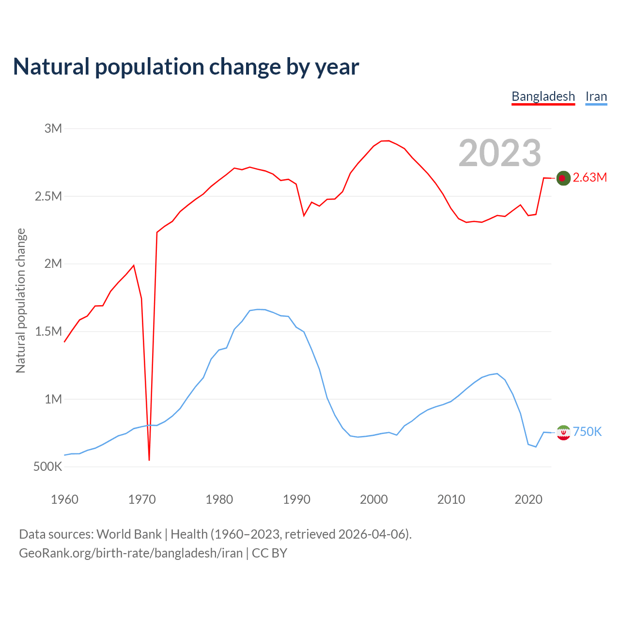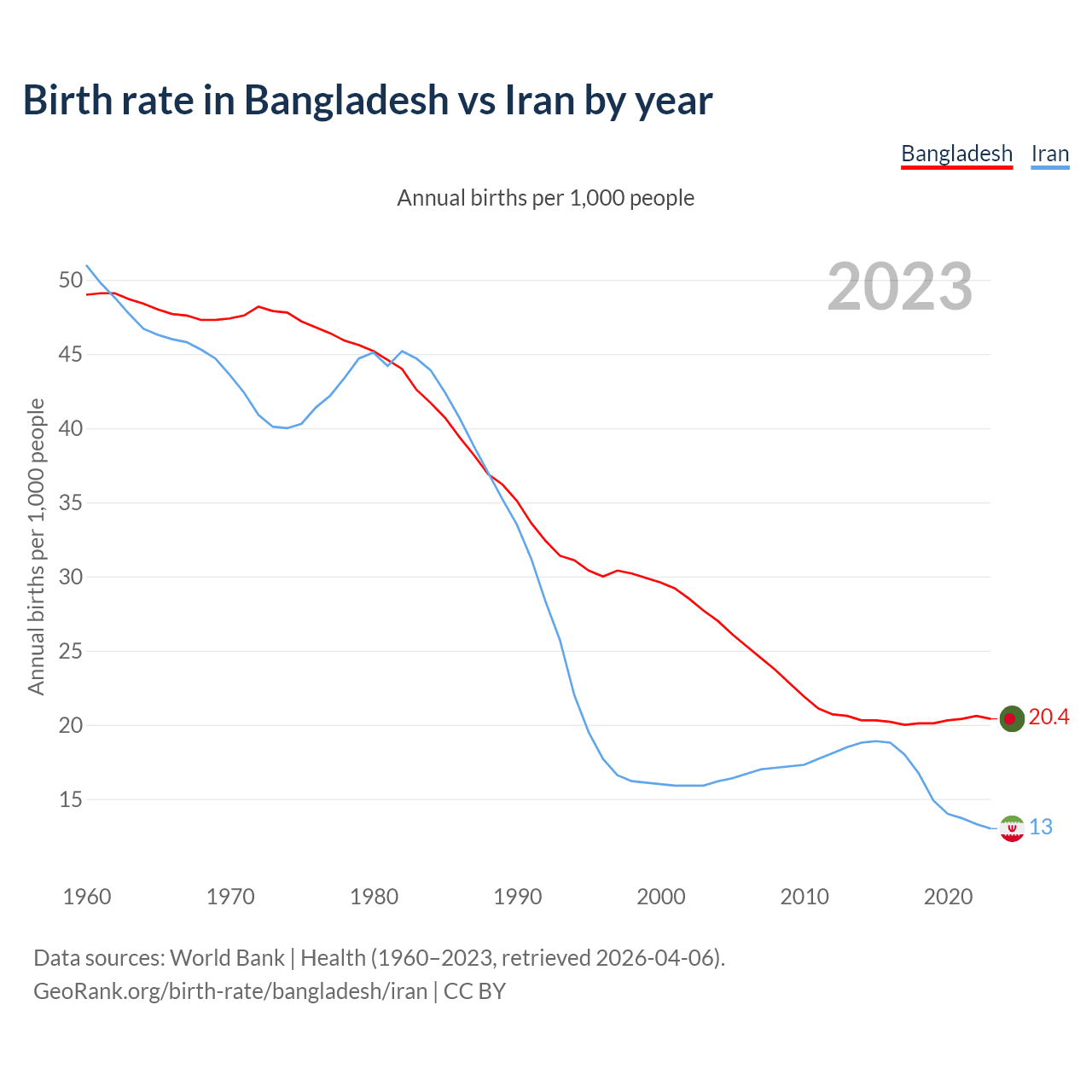 Bangladesh has an annual birth rate of 20.4 births per 1,000 people, compared to 13 for Iran. The average number of children a woman is expected to have during her lifetime — the fertility rate, is 2.16 in Bangladesh and 1.7 in Iran — 21.6% difference.