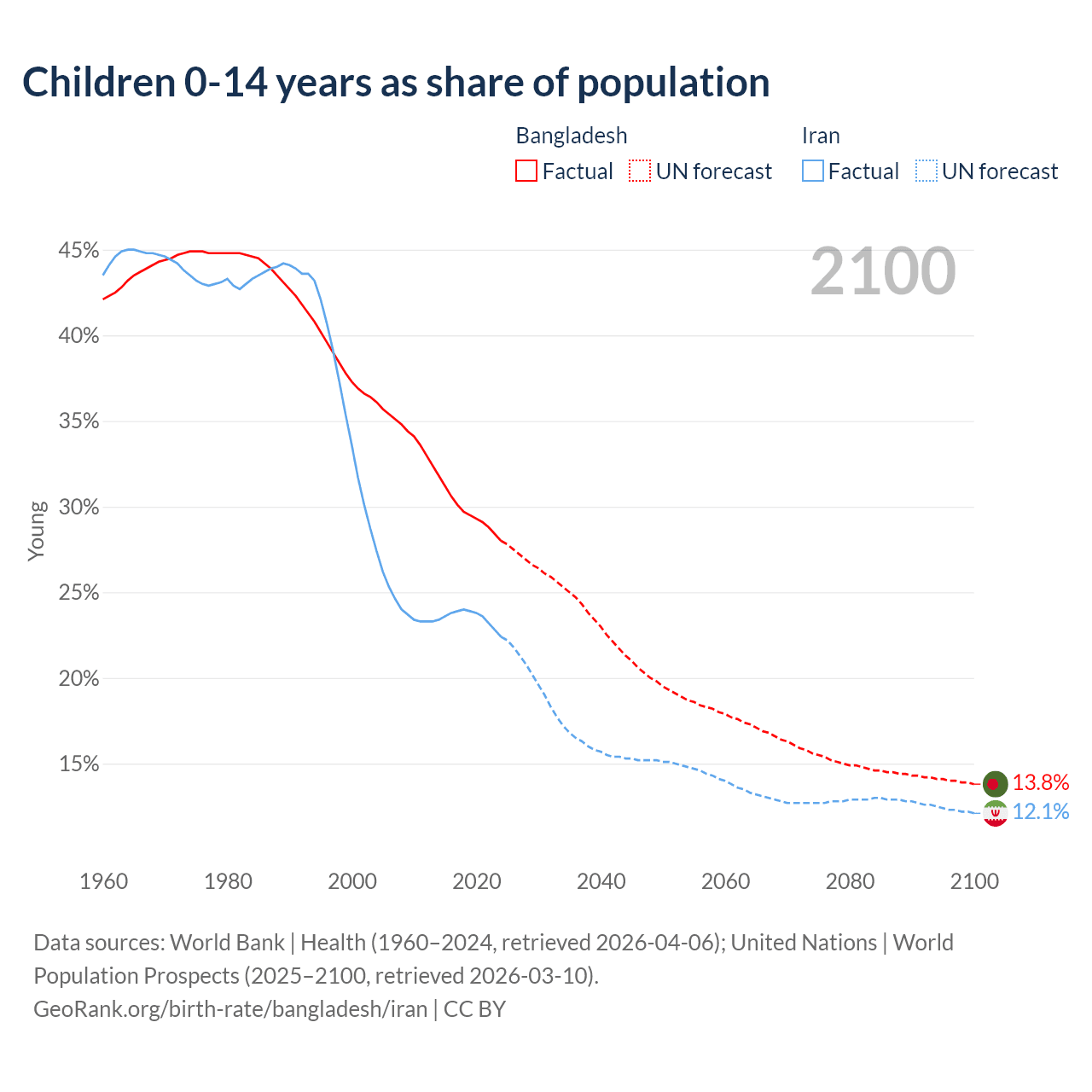 According to the latest available data on birth rates, the fertility rate in Bangladesh was 2.16 children per woman in 2023, compared to 1.7 in Iran in 2023. The replacement level is considered to be 2.1 children per woman.