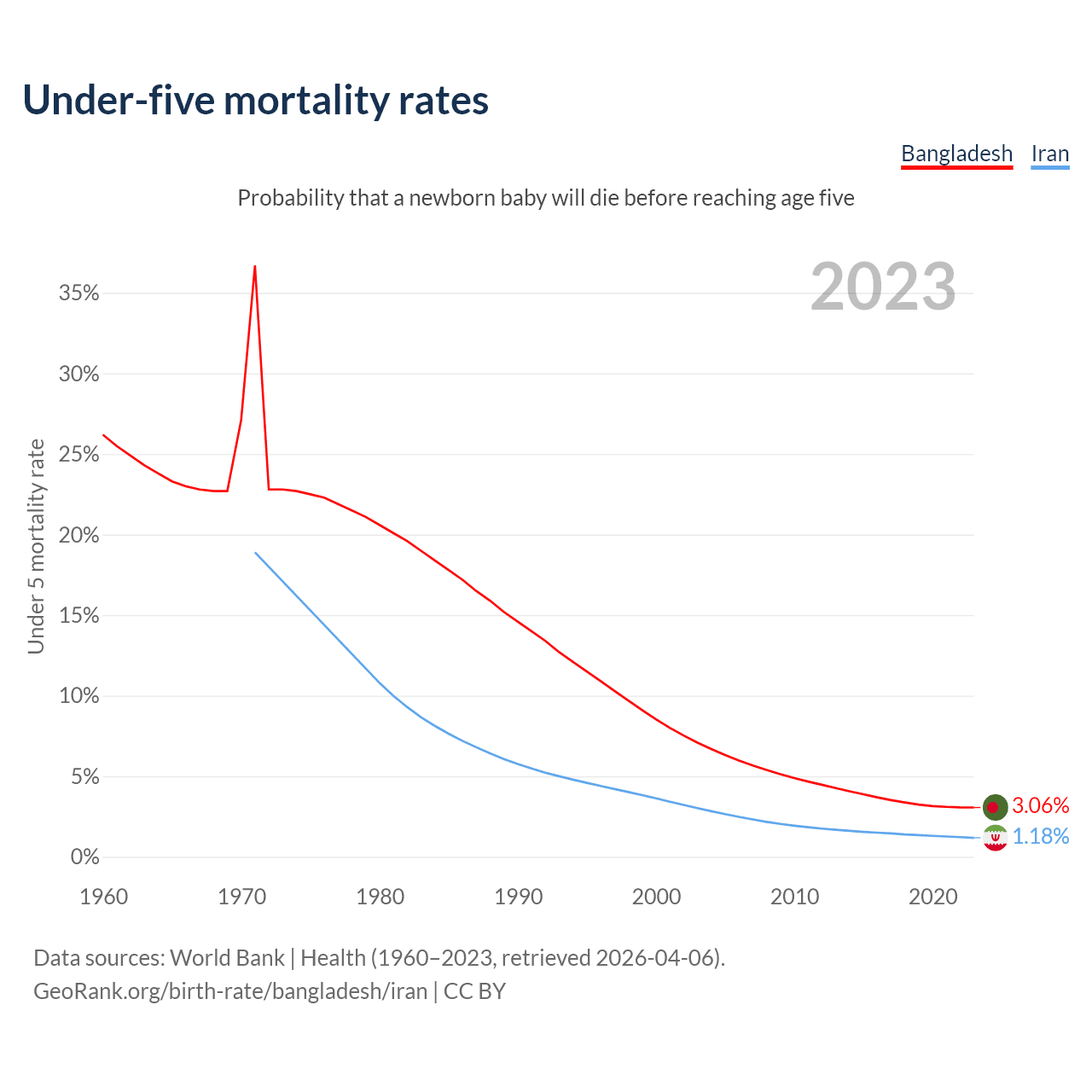 The chance that a newborn baby will die before reaching age five is 3.06% in Bangladesh and 1.18% in Iran. Above is a chart with historical data on under-five mortality rates.