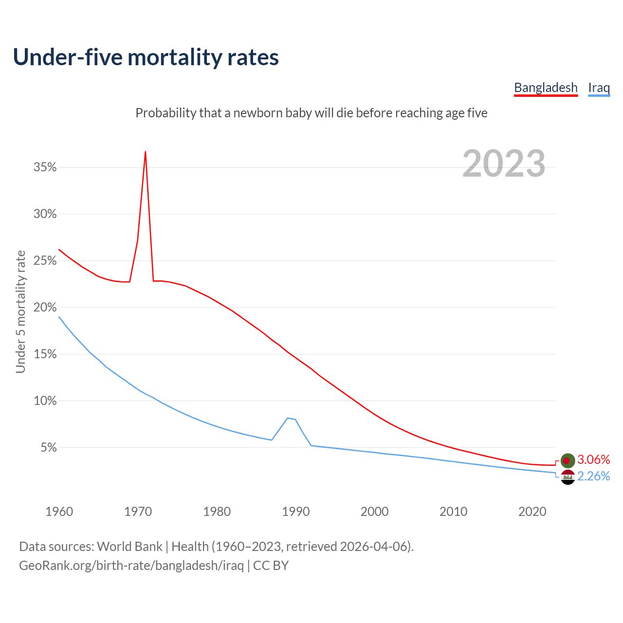 The chance that a newborn baby will die before reaching age five is 3.06% in Bangladesh and 2.26% in Iraq. Above is a chart with historical data on under-five mortality rates.