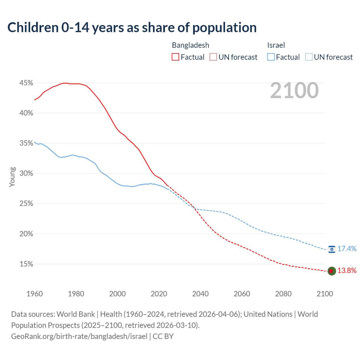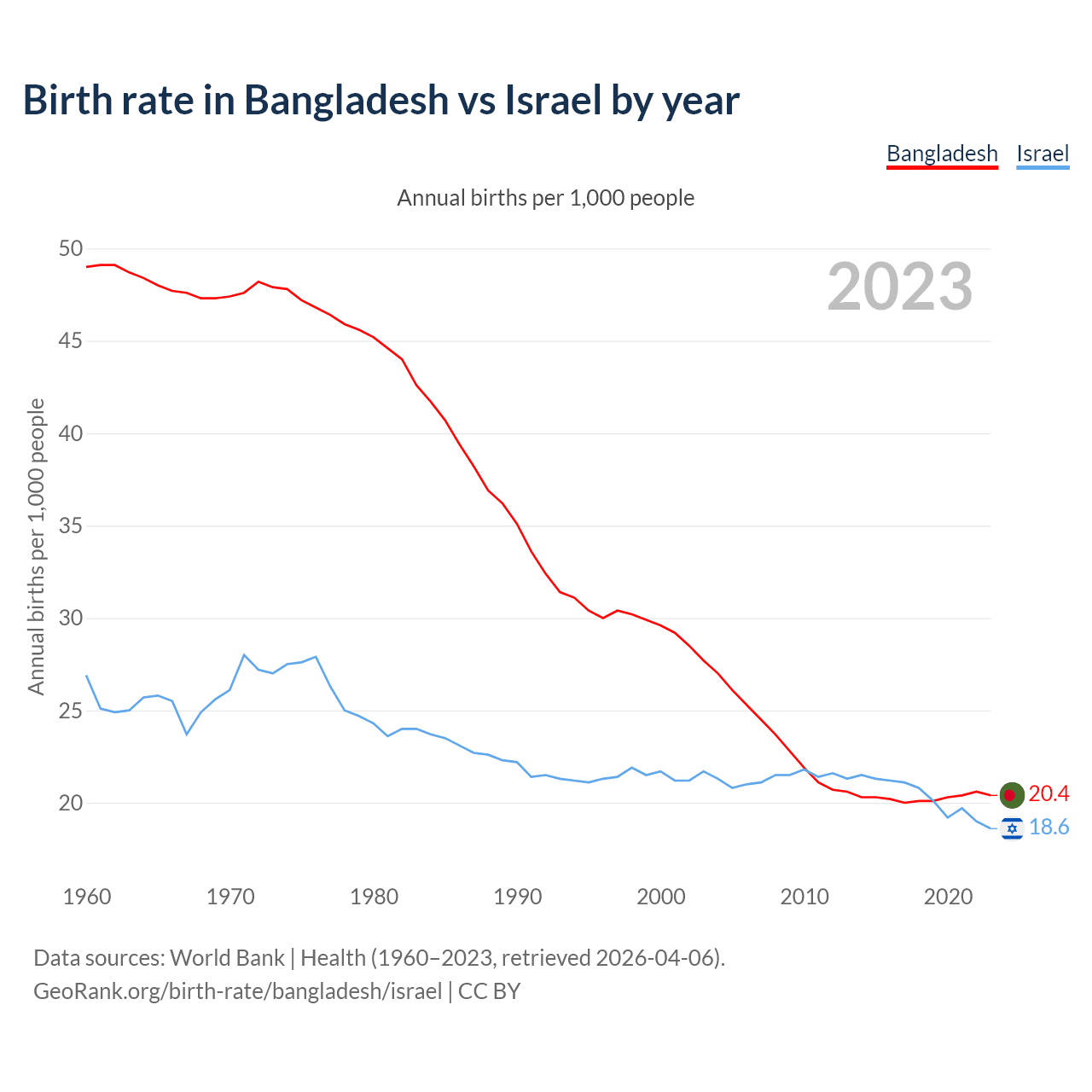 According to the latest available data on birth rates, the fertility rate in Bangladesh was 2.16 children per woman in 2023, compared to 2.85 in Israel in 2023. The replacement level is considered to be 2.1 children per woman.
