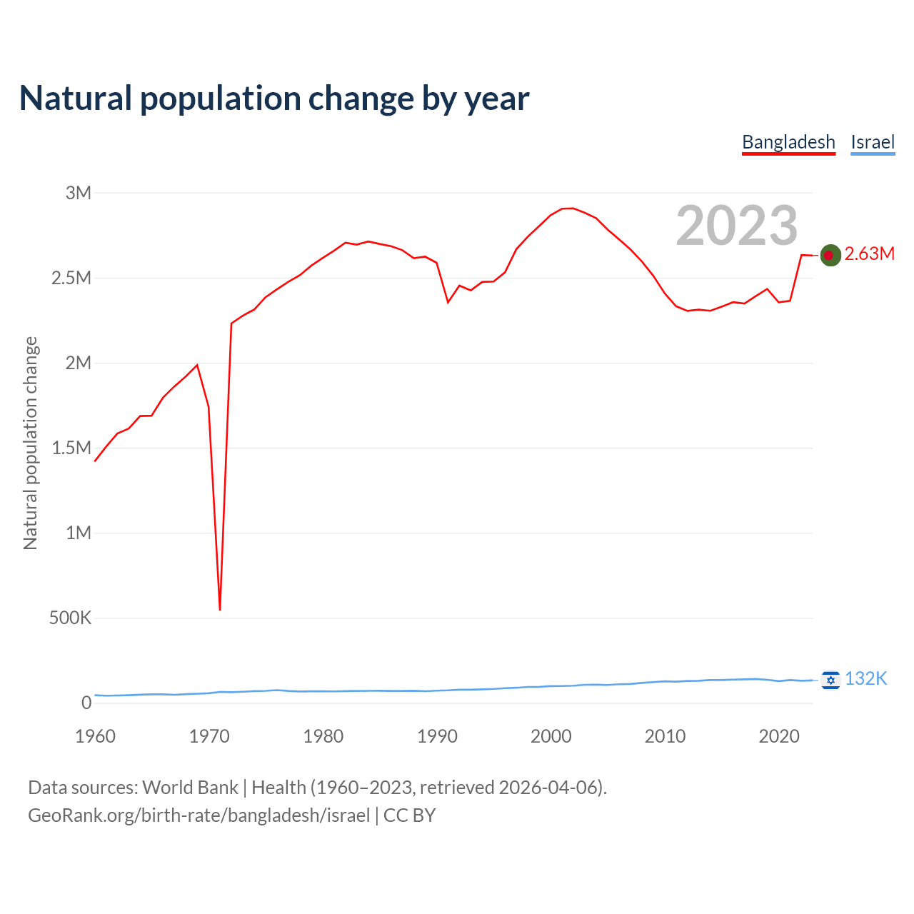 Bangladesh has an annual birth rate of 20.4 births per 1,000 people, compared to 18.6 for Israel. The average number of children a woman is expected to have during her lifetime — the fertility rate, is 2.16 in Bangladesh and 2.85 in Israel — 31.8% difference.