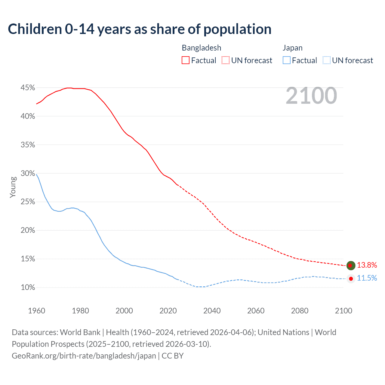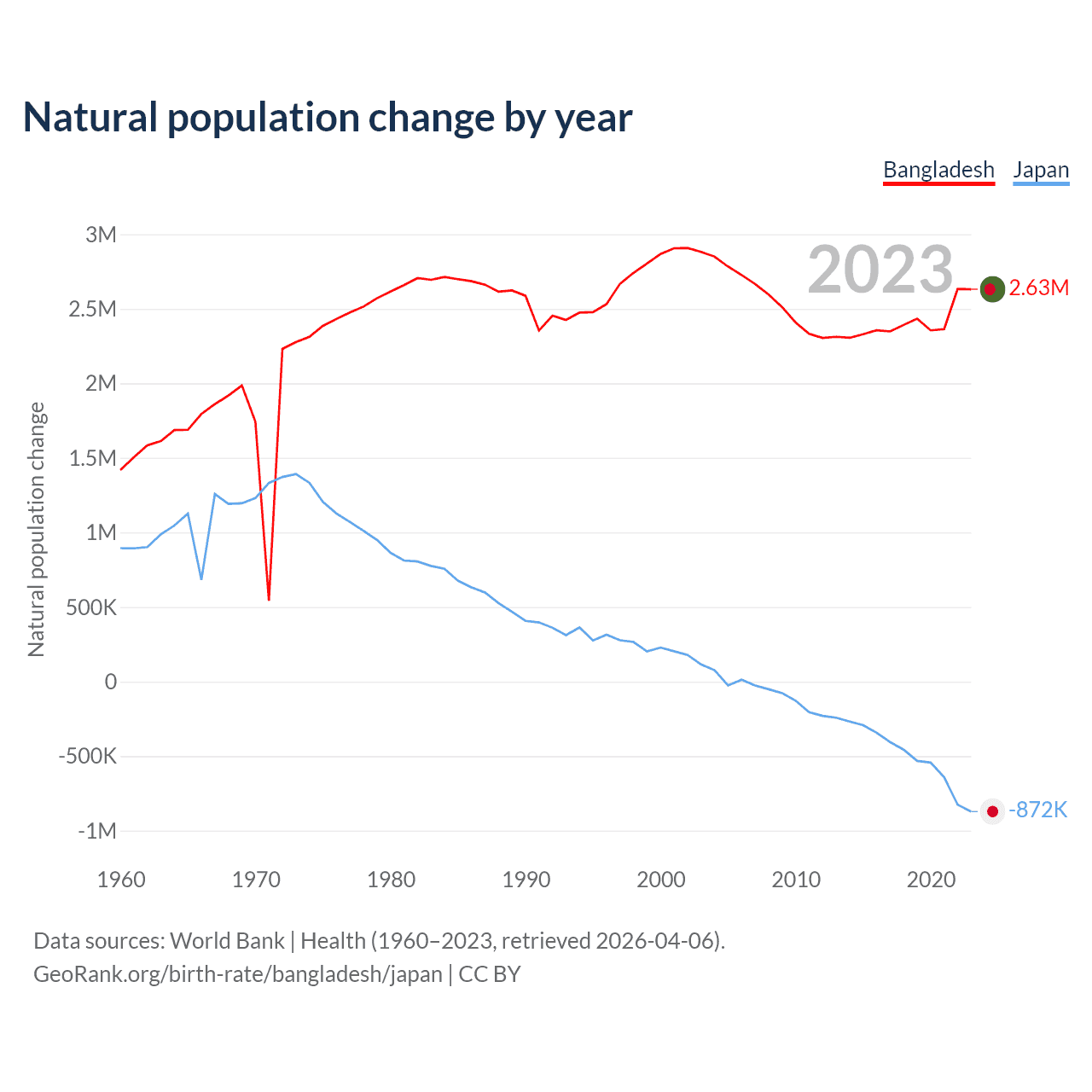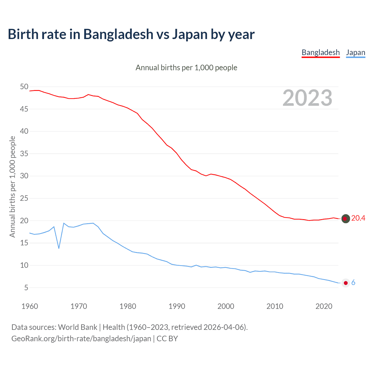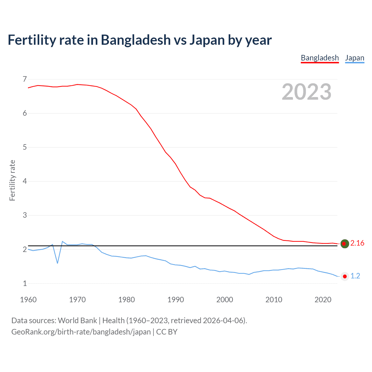 According to the latest available data on birth rates, the fertility rate in Bangladesh was 2.16 children per woman in 2023, compared to 1.2 in Japan in 2023. The replacement level is considered to be 2.1 children per woman.