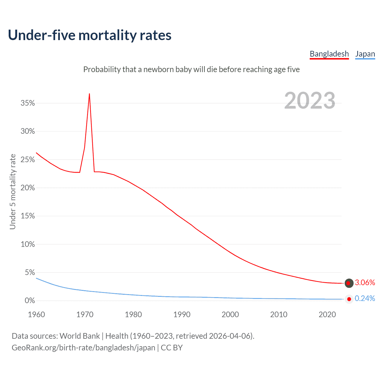 The chance that a newborn baby will die before reaching age five is 3.06% in Bangladesh and 0.24% in Japan. Above is a chart with historical data on under-five mortality rates.