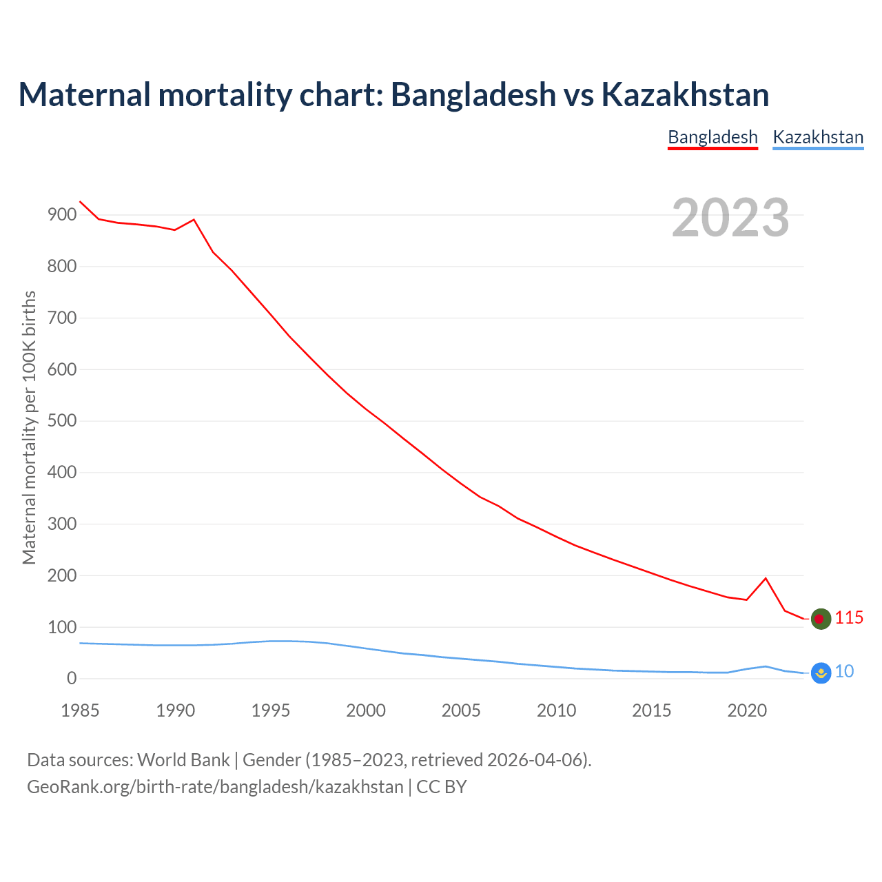 The maternal mortality rate, which is the probability of dying during childbirth or within 42 days of pregnancy termination, is 115 deaths per 100,000 live births in Bangladesh, compared to 10 deaths in Kazakhstan.