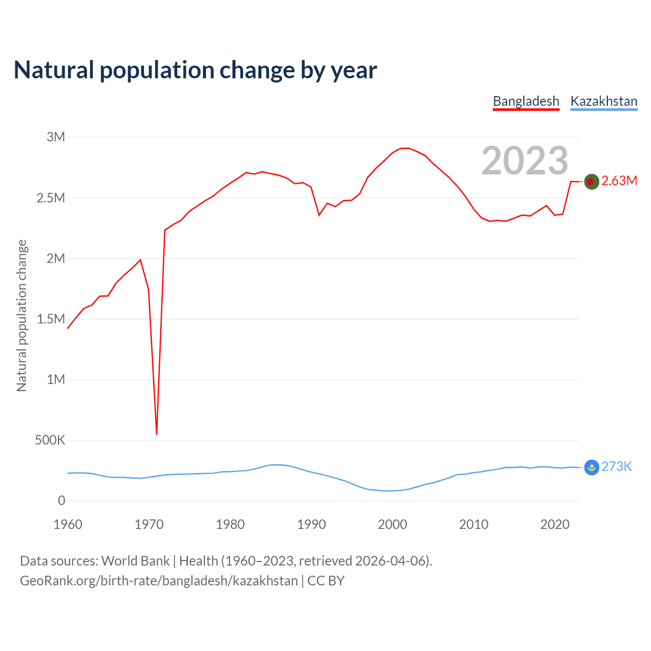According to the latest available data on birth rates, the fertility rate in Bangladesh was 2.16 children per woman in 2023, compared to 3.01 in Kazakhstan in 2023. The replacement level is considered to be 2.1 children per woman.