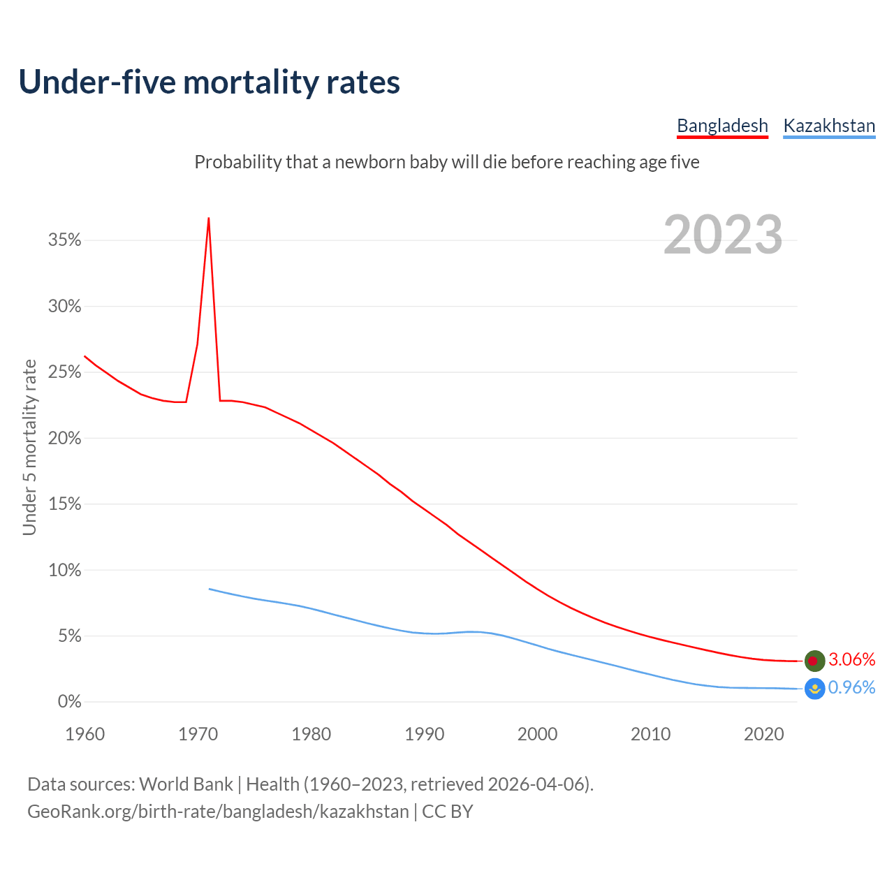 The chance that a newborn baby will die before reaching age five is 3.06% in Bangladesh and 0.96% in Kazakhstan. Above is a chart with historical data on under-five mortality rates.