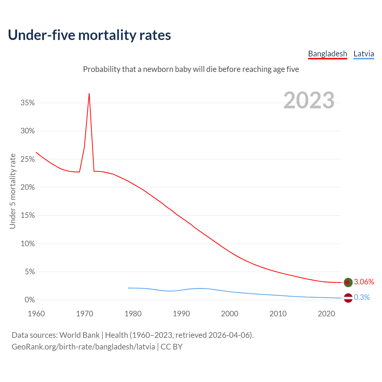 The chance that a newborn baby will die before reaching age five is 3.06% in Bangladesh and 0.3% in Latvia. Above is a chart with historical data on under-five mortality rates.