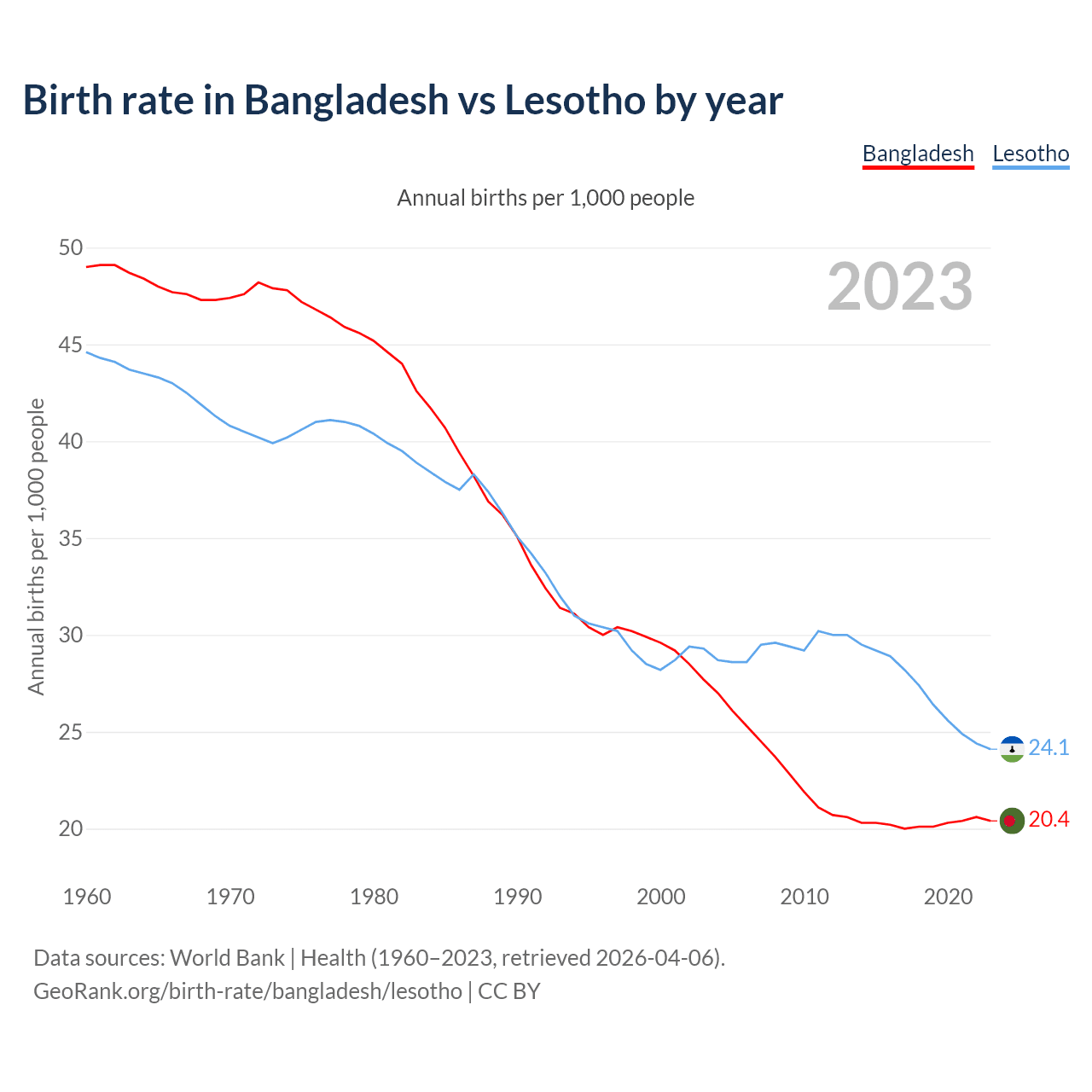 Bangladesh has an annual birth rate of 20.4 births per 1,000 people, compared to 24.1 for Lesotho. The average number of children a woman is expected to have during her lifetime — the fertility rate, is 2.16 in Bangladesh and 2.69 in Lesotho — 24.5% difference.