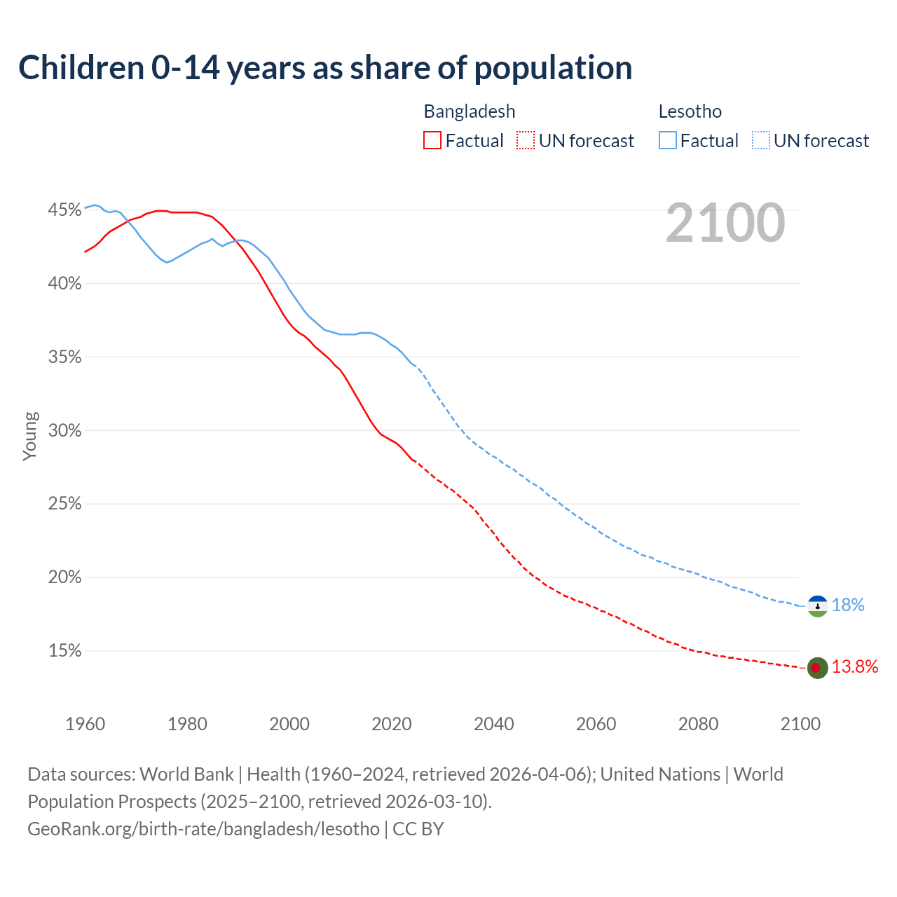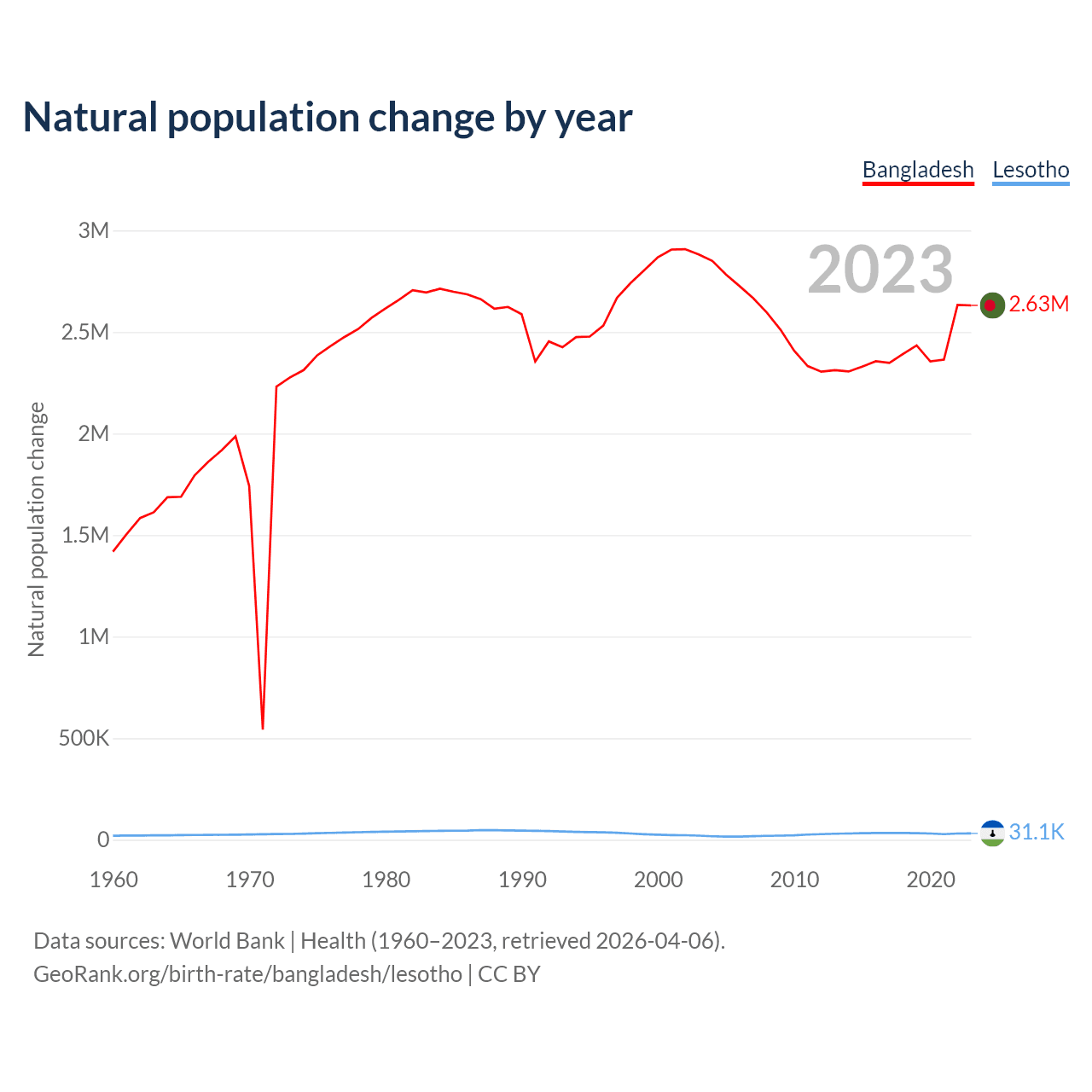 According to the latest available data on birth rates, the fertility rate in Bangladesh was 2.16 children per woman in 2023, compared to 2.69 in Lesotho in 2023. The replacement level is considered to be 2.1 children per woman.