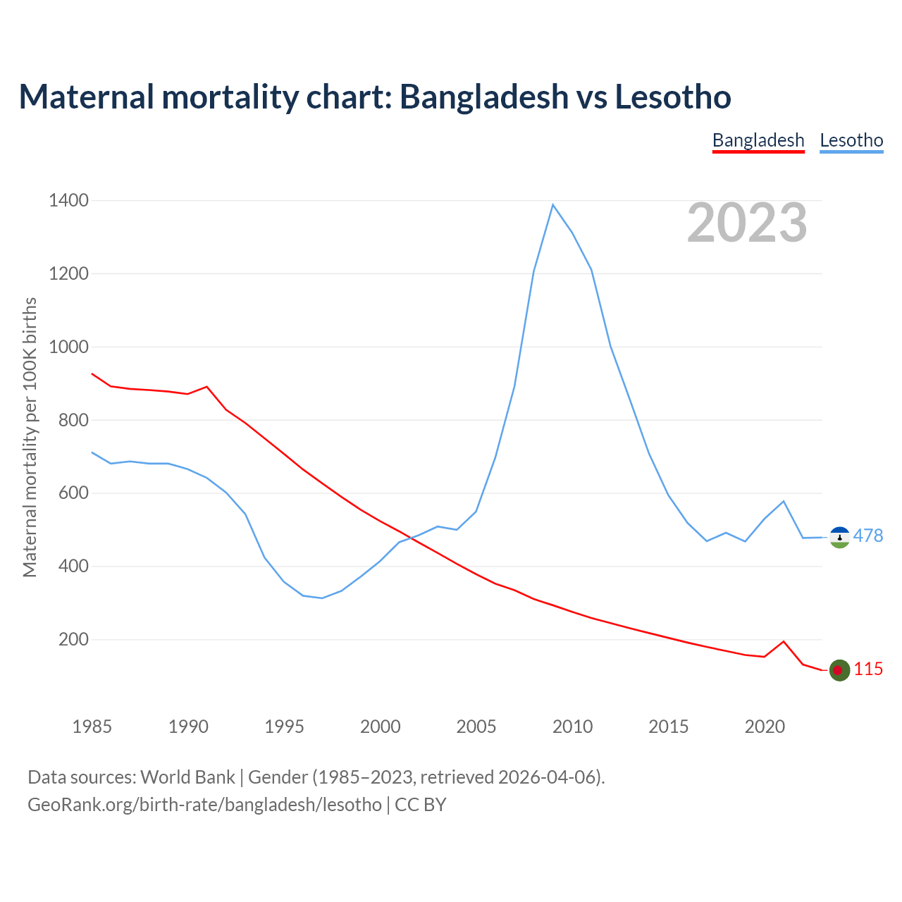 - Annual births per 1,000 women ages 15-19 (adolescent birth rate or teenage mother rate) is 73.2 in Bangladesh vs 70.6 in Lesotho.