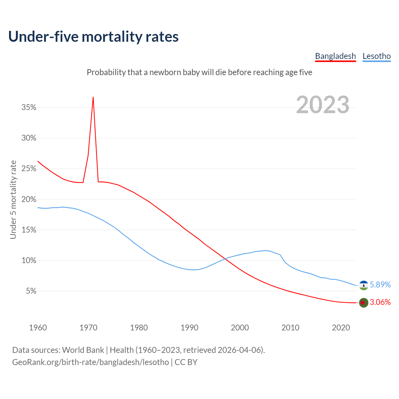 The chance that a newborn baby will die before reaching age five is 3.06% in Bangladesh and 5.89% in Lesotho. Above is a chart with historical data on under-five mortality rates.