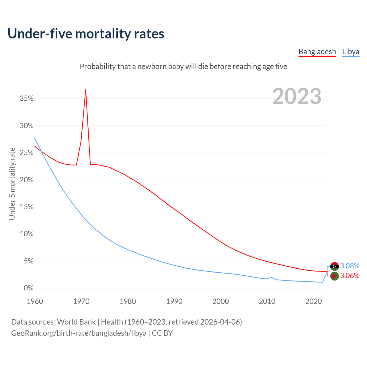 The chance that a newborn baby will die before reaching age five is 3.06% in Bangladesh and 3.08% in Libya. Above is a chart with historical data on under-five mortality rates.