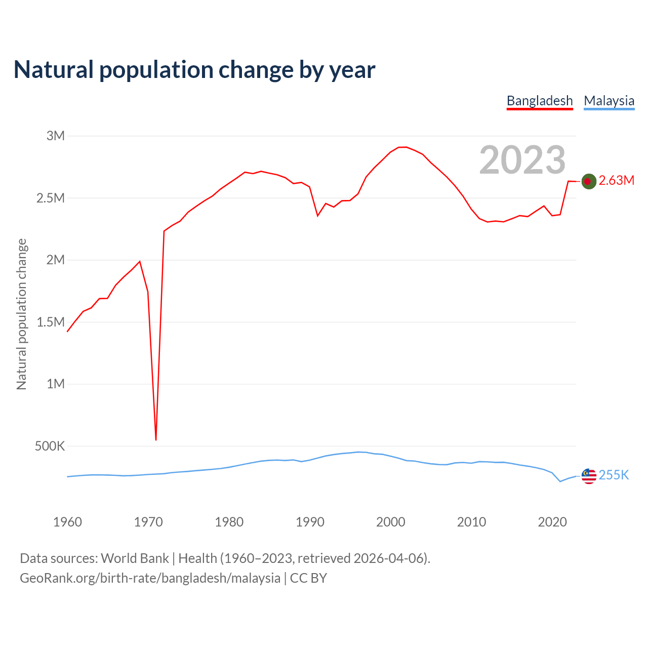 Data sources: World Bank | Health (1960–2023, retrieved 2026-04-06).