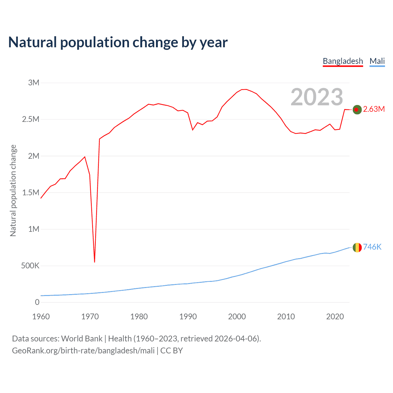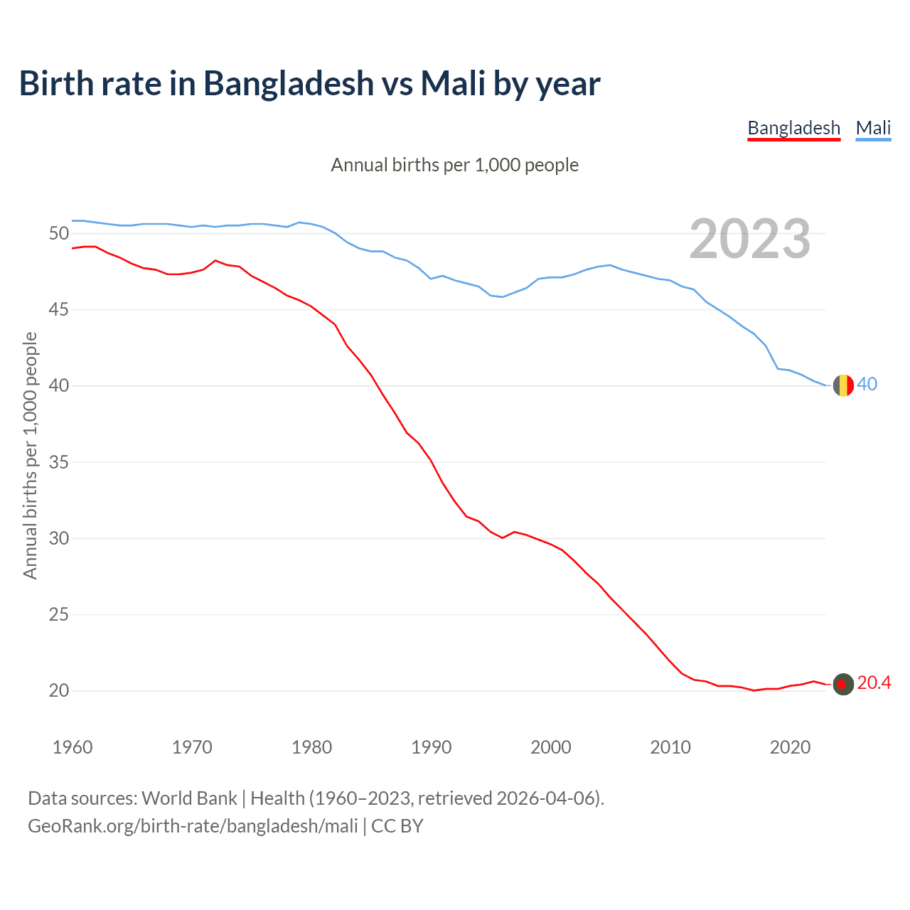 Bangladesh has an annual birth rate of 20.4 births per 1,000 people, compared to 40 for Mali. The average number of children a woman is expected to have during her lifetime — the fertility rate, is 2.16 in Bangladesh and 5.61 in Mali — 159.5% difference.