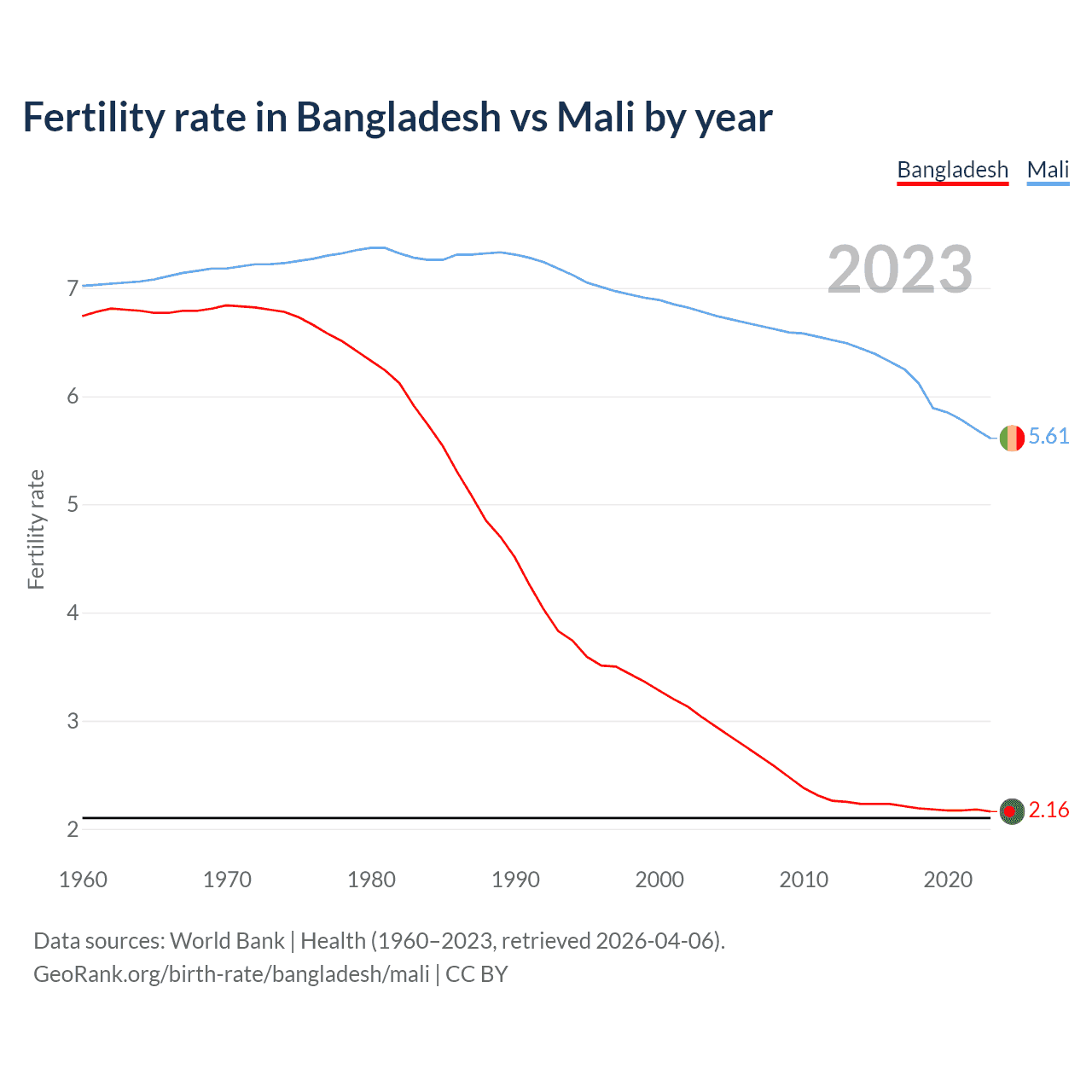 According to the latest available data on birth rates, the fertility rate in Bangladesh was 2.16 children per woman in 2023, compared to 5.61 in Mali in 2023. The replacement level is considered to be 2.1 children per woman.