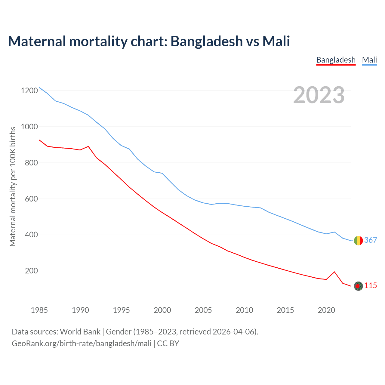 - Annual births per 1,000 women ages 15-19 (adolescent birth rate or teenage mother rate) is 73.2 in Bangladesh vs 138.6 in Mali.
