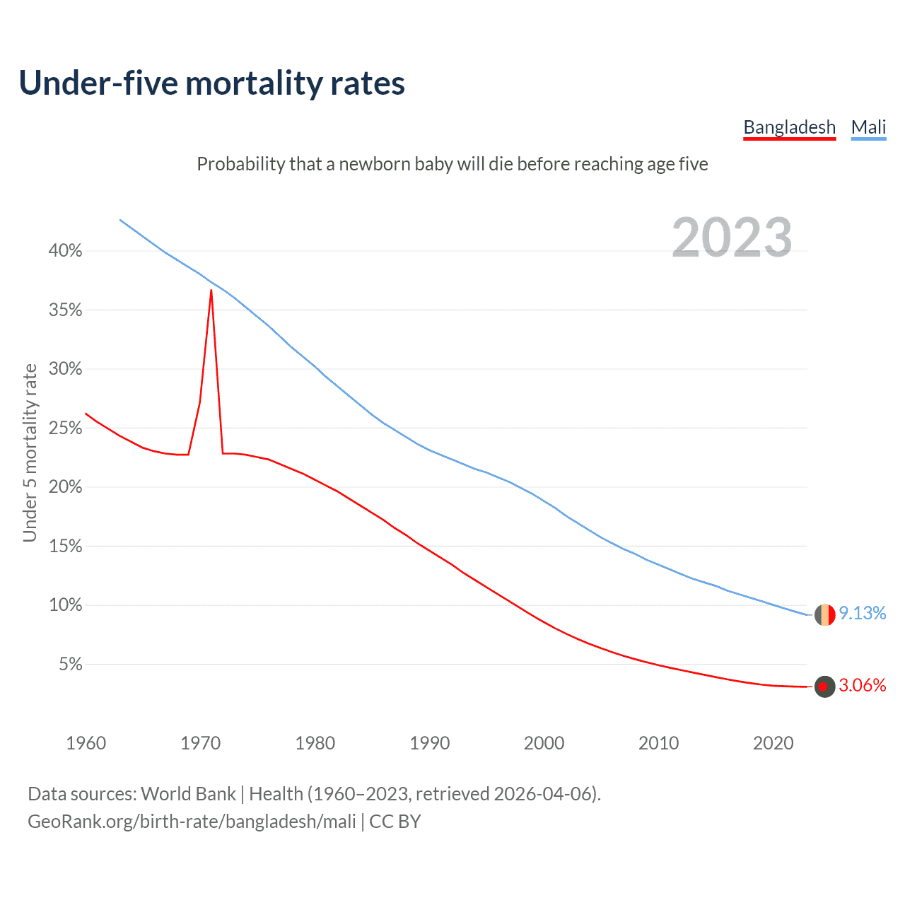 The chance that a newborn baby will die before reaching age five is 3.06% in Bangladesh and 9.13% in Mali. Above is a chart with historical data on under-five mortality rates.