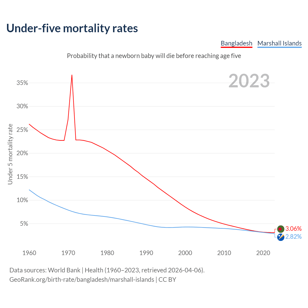 The chance that a newborn baby will die before reaching age five is 3.06% in Bangladesh and 2.82% in the Marshall Islands. Above is a chart with historical data on under-five mortality rates.