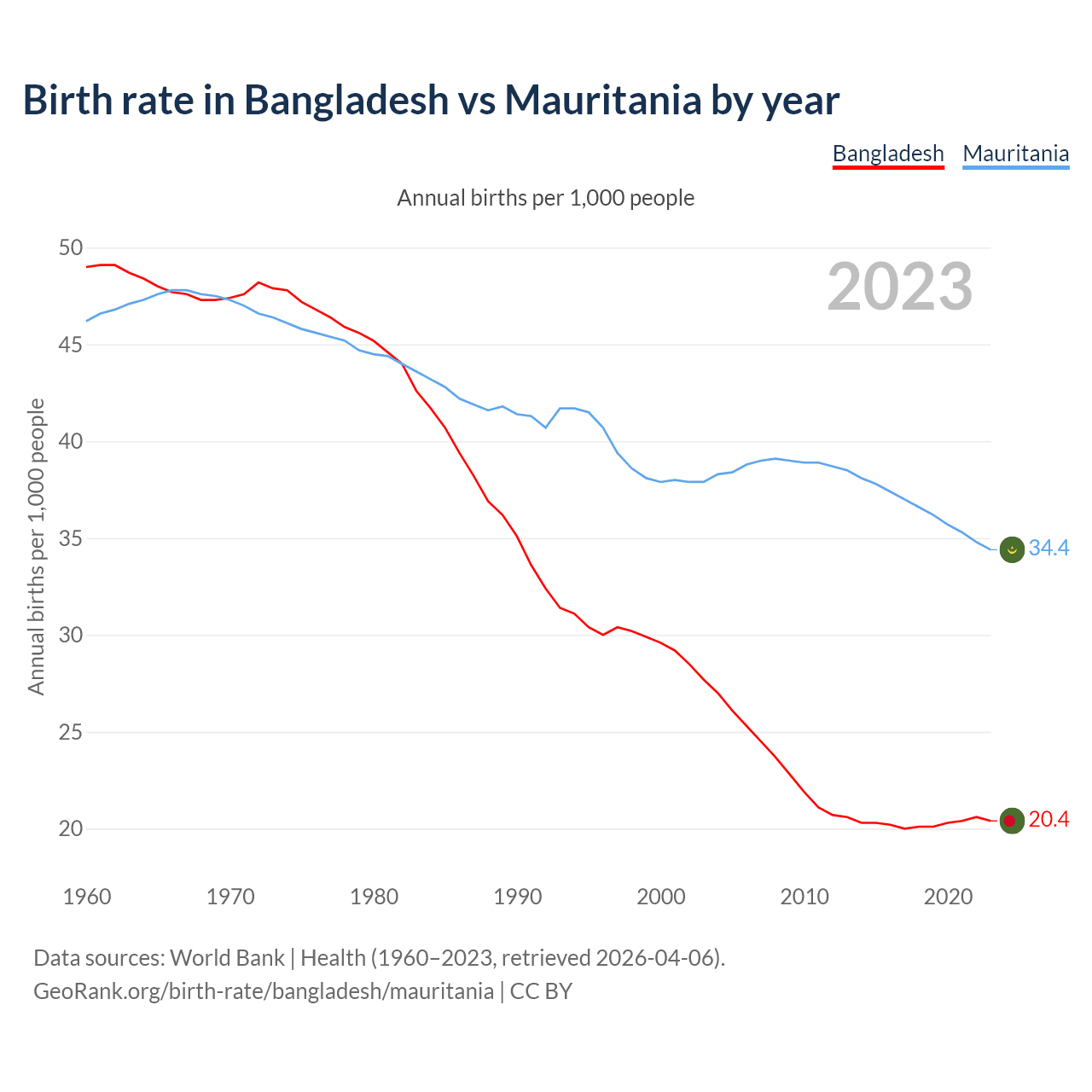 Bangladesh has an annual birth rate of 20.4 births per 1,000 people, compared to 34.4 for Mauritania. The average number of children a woman is expected to have during her lifetime — the fertility rate, is 2.16 in Bangladesh and 4.7 in Mauritania — 117.2% difference.