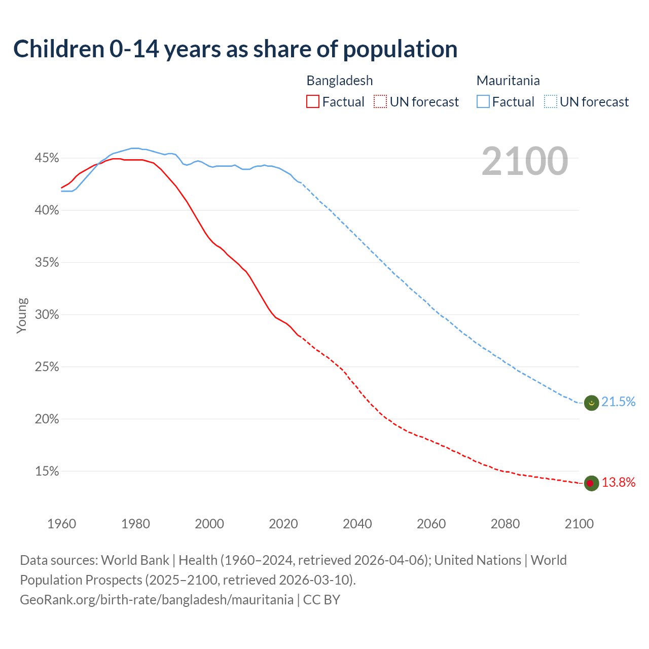 According to the latest available data on birth rates, the fertility rate in Bangladesh was 2.16 children per woman in 2023, compared to 4.7 in Mauritania in 2023. The replacement level is considered to be 2.1 children per woman.