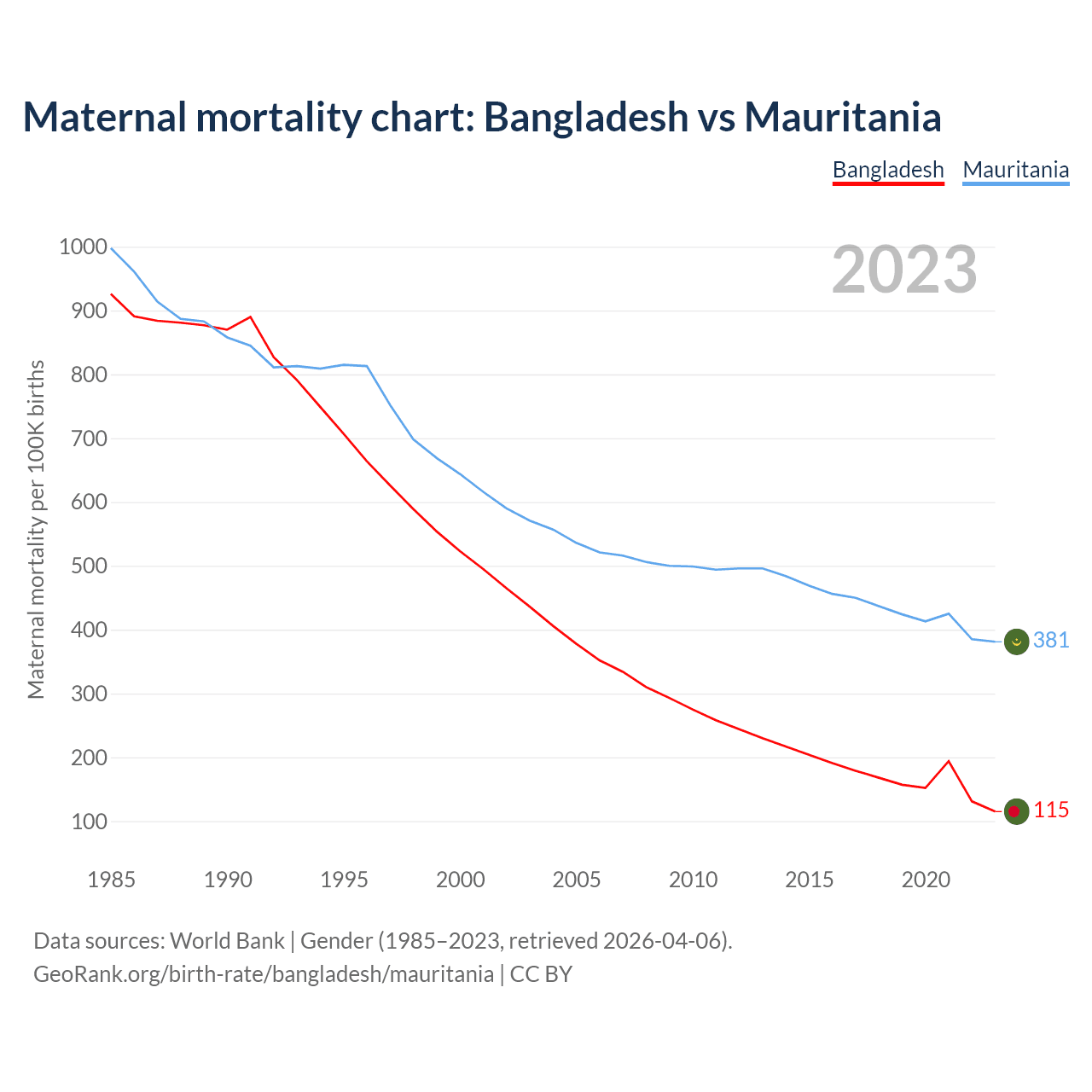 The maternal mortality rate, which is the probability of dying during childbirth or within 42 days of pregnancy termination, is 115 deaths per 100,000 live births in Bangladesh, compared to 381 deaths in Mauritania.