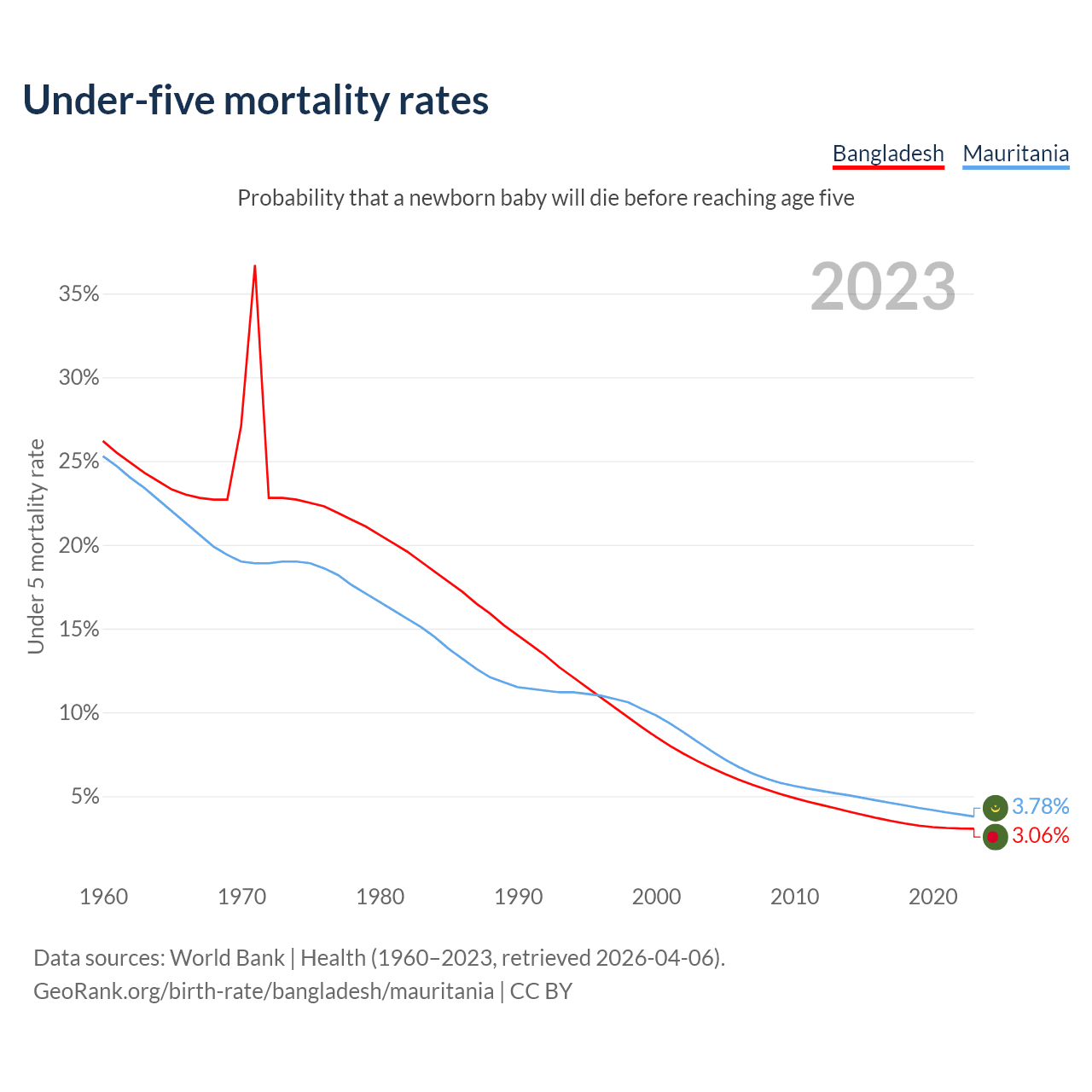 The chance that a newborn baby will die before reaching age five is 3.06% in Bangladesh and 3.78% in Mauritania. Above is a chart with historical data on under-five mortality rates.