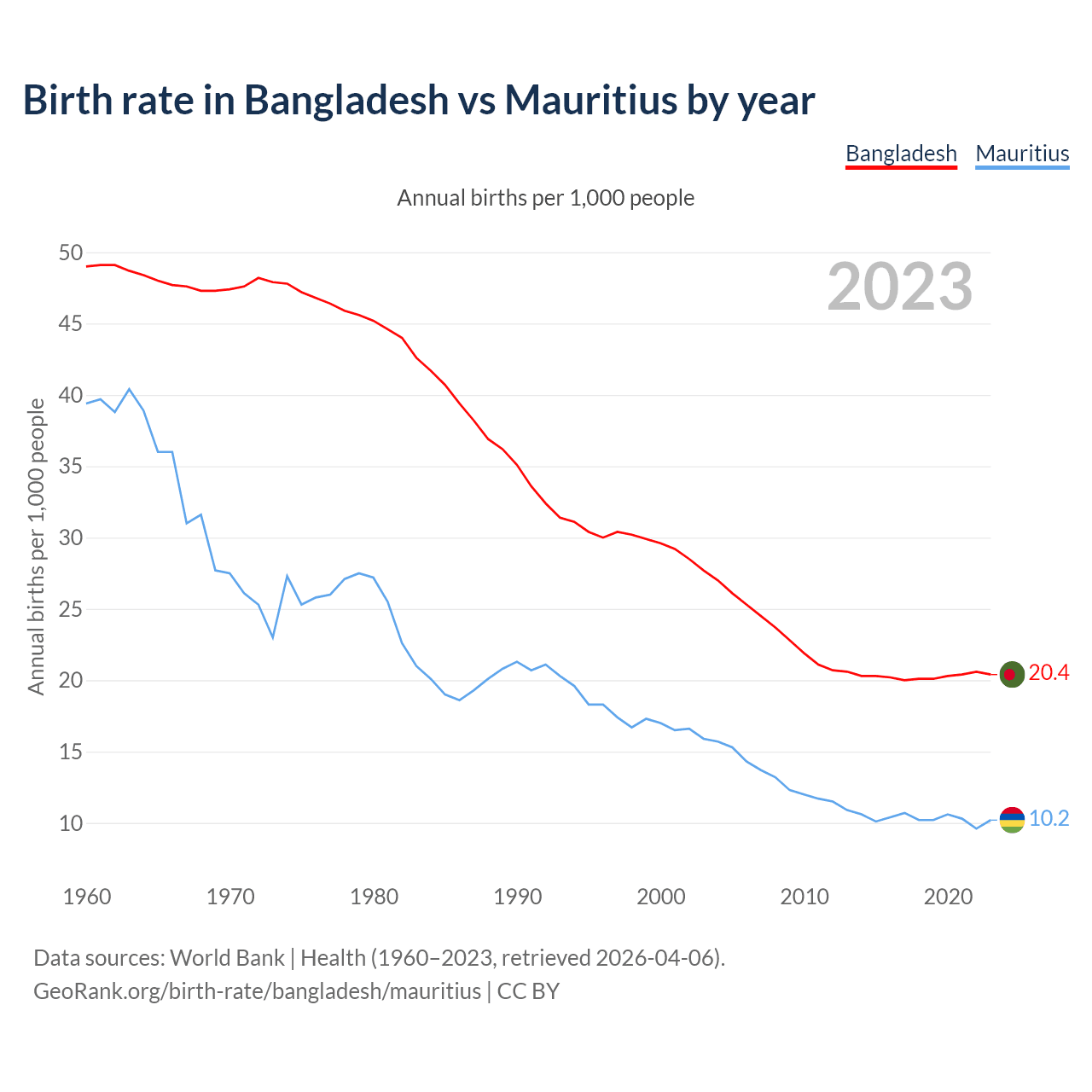 Bangladesh has an annual birth rate of 20.4 births per 1,000 people, compared to 10.2 for Mauritius. The average number of children a woman is expected to have during her lifetime — the fertility rate, is 2.16 in Bangladesh and 1.39 in Mauritius — 35.7% difference.