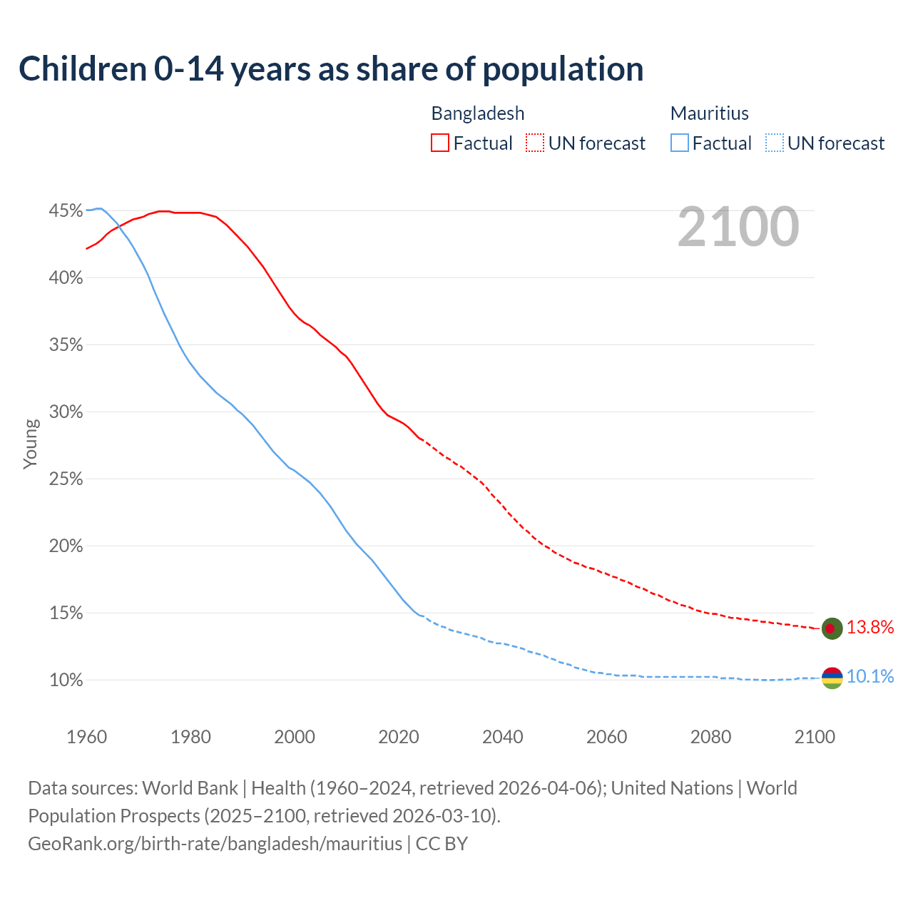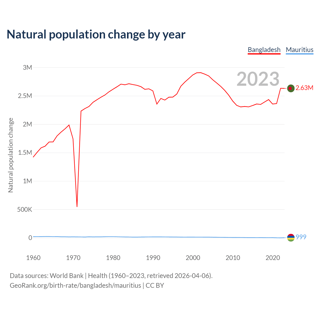 According to the latest available data on birth rates, the fertility rate in Bangladesh was 2.16 children per woman in 2023, compared to 1.39 in Mauritius in 2023. The replacement level is considered to be 2.1 children per woman.