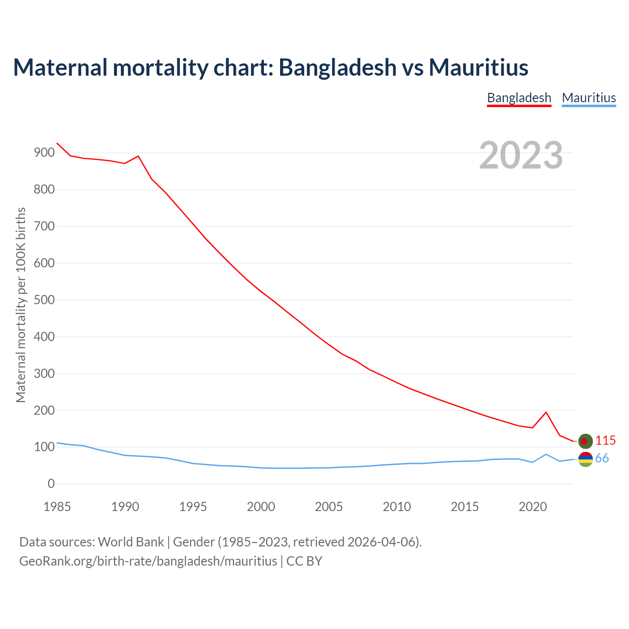 The maternal mortality rate, which is the probability of dying during childbirth or within 42 days of pregnancy termination, is 115 deaths per 100,000 live births in Bangladesh, compared to 66 deaths in Mauritius.