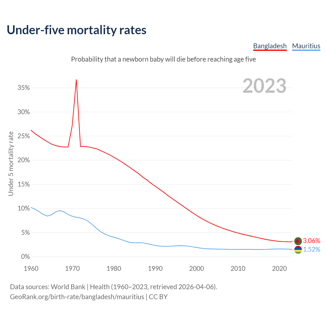 The chance that a newborn baby will die before reaching age five is 3.06% in Bangladesh and 1.52% in Mauritius. Above is a chart with historical data on under-five mortality rates.
