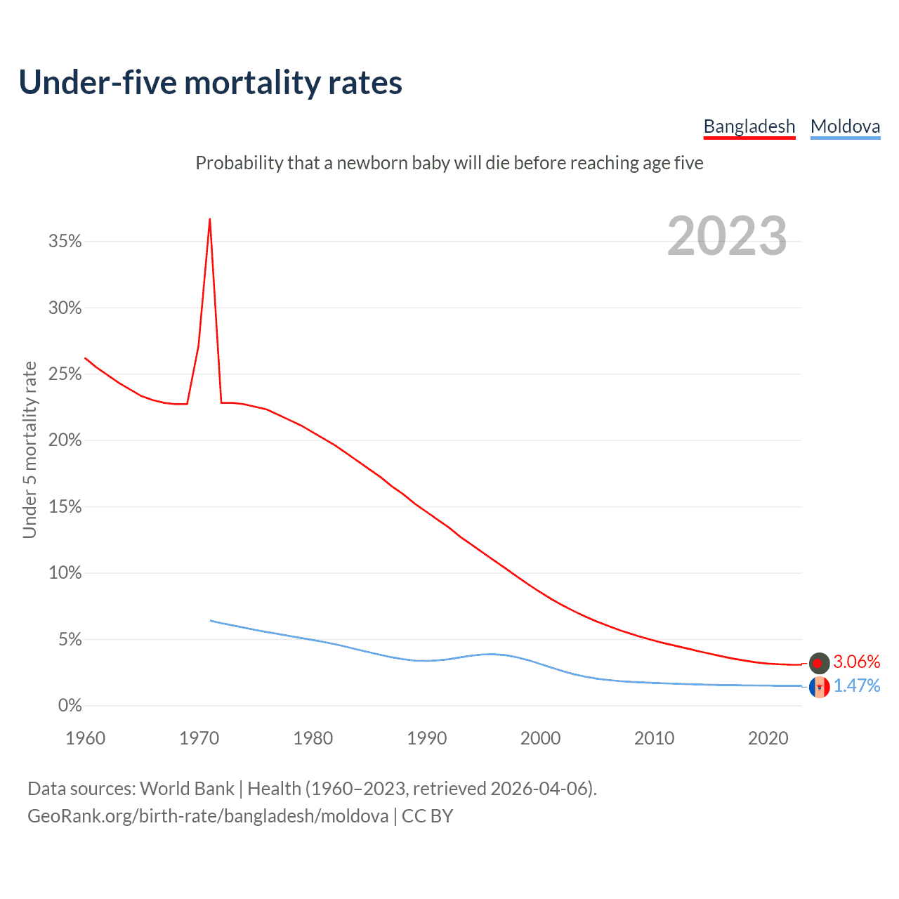 The chance that a newborn baby will die before reaching age five is 3.06% in Bangladesh and 1.47% in Moldova. Above is a chart with historical data on under-five mortality rates.