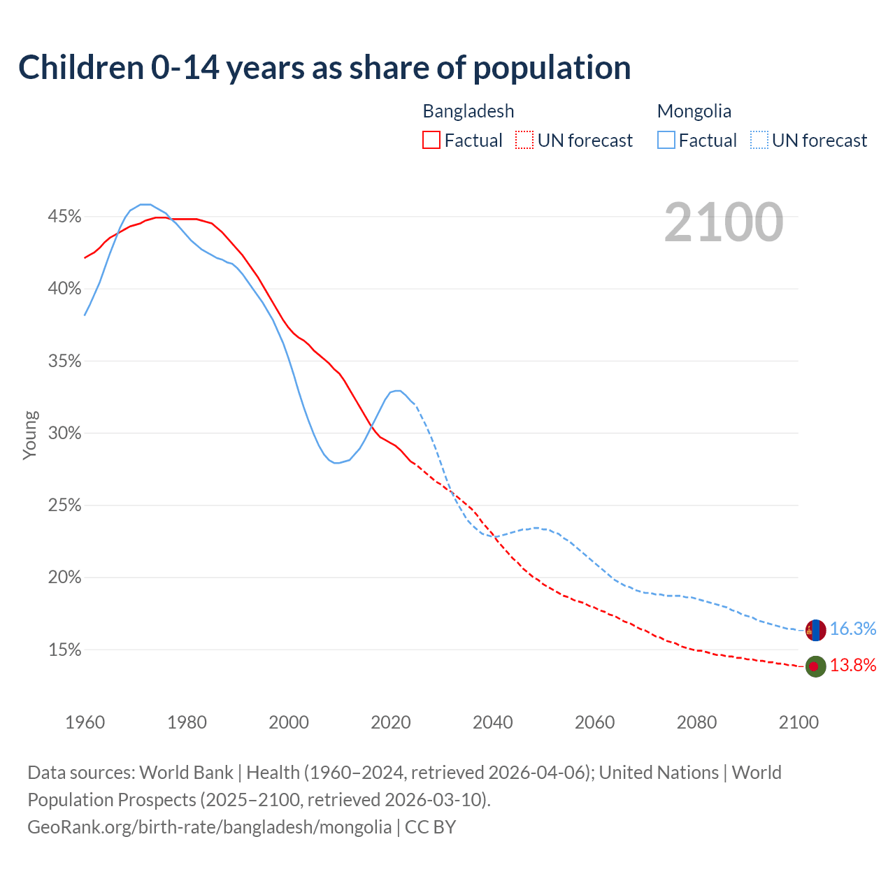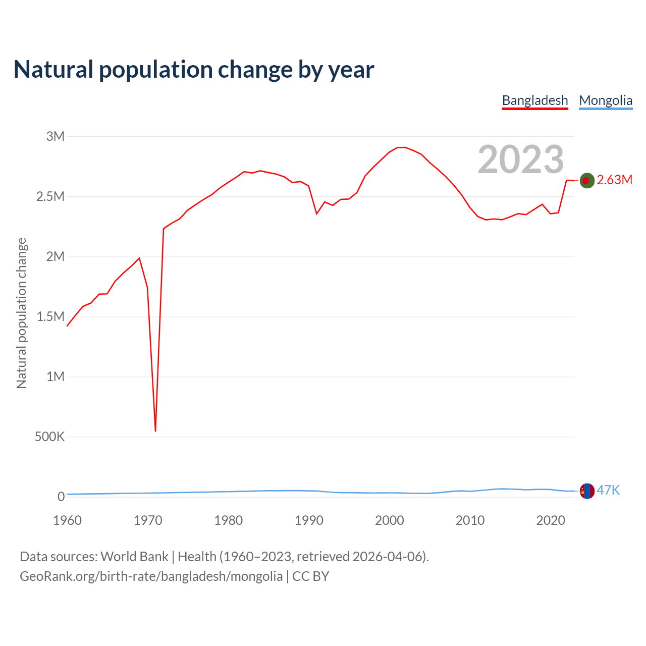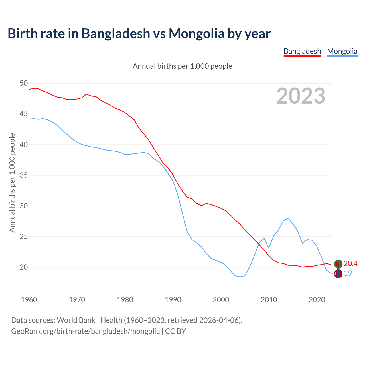 According to the latest available data on birth rates, the fertility rate in Bangladesh was 2.16 children per woman in 2023, compared to 2.7 in Mongolia in 2023. The replacement level is considered to be 2.1 children per woman.