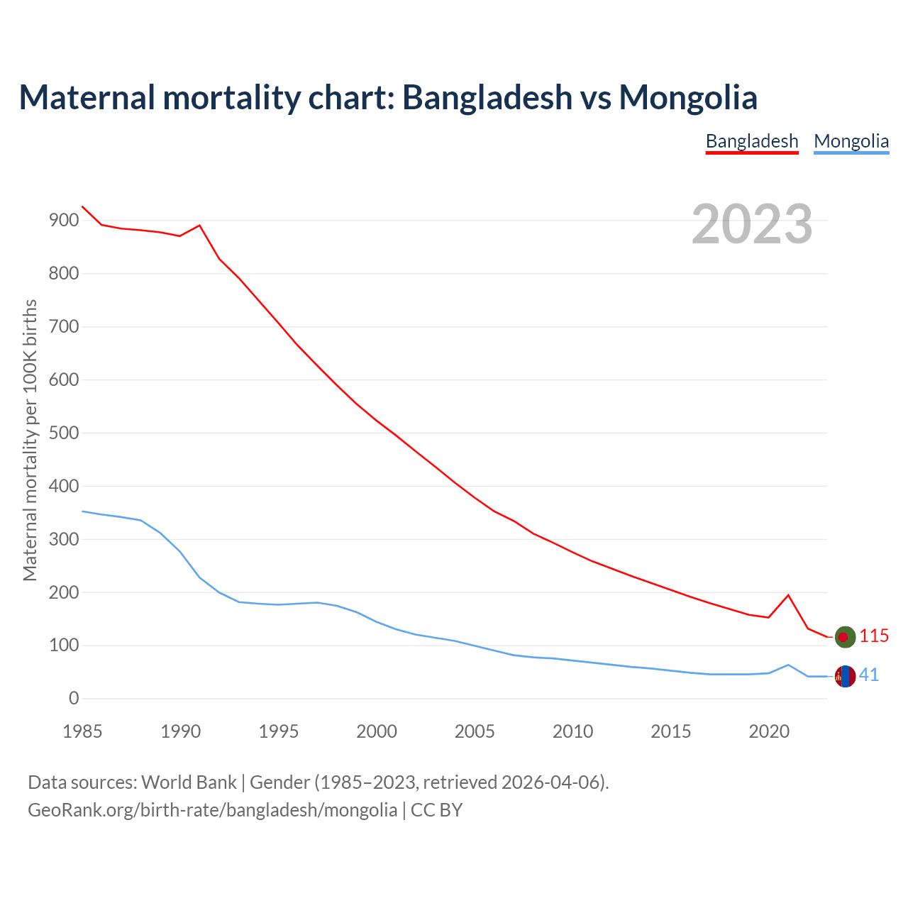 The maternal mortality rate, which is the probability of dying during childbirth or within 42 days of pregnancy termination, is 115 deaths per 100,000 live births in Bangladesh, compared to 41 deaths in Mongolia.