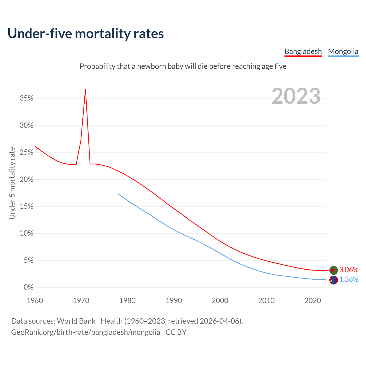 The chance that a newborn baby will die before reaching age five is 3.06% in Bangladesh and 1.36% in Mongolia. Above is a chart with historical data on under-five mortality rates.