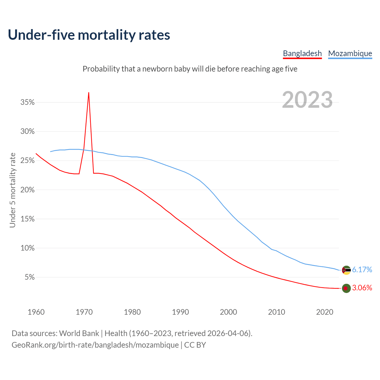 The chance that a newborn baby will die before reaching age five is 3.06% in Bangladesh and 6.17% in Mozambique. Above is a chart with historical data on under-five mortality rates.