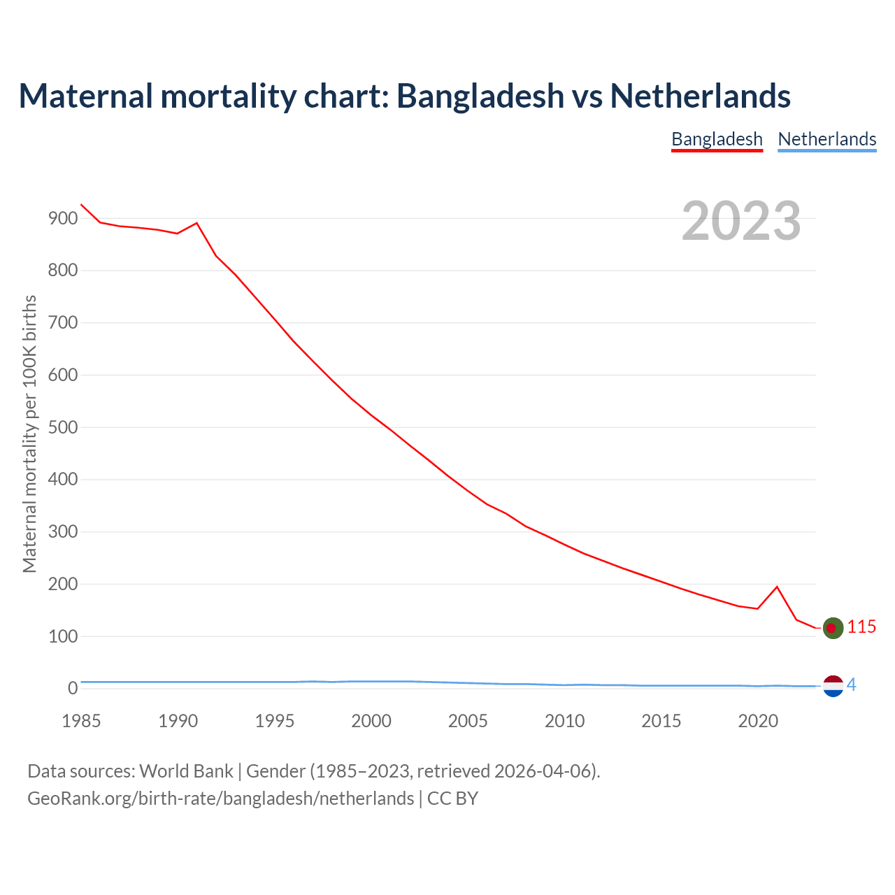 The maternal mortality rate, which is the probability of dying during childbirth or within 42 days of pregnancy termination, is 115 deaths per 100,000 live births in Bangladesh, compared to 4 deaths in the Netherlands.