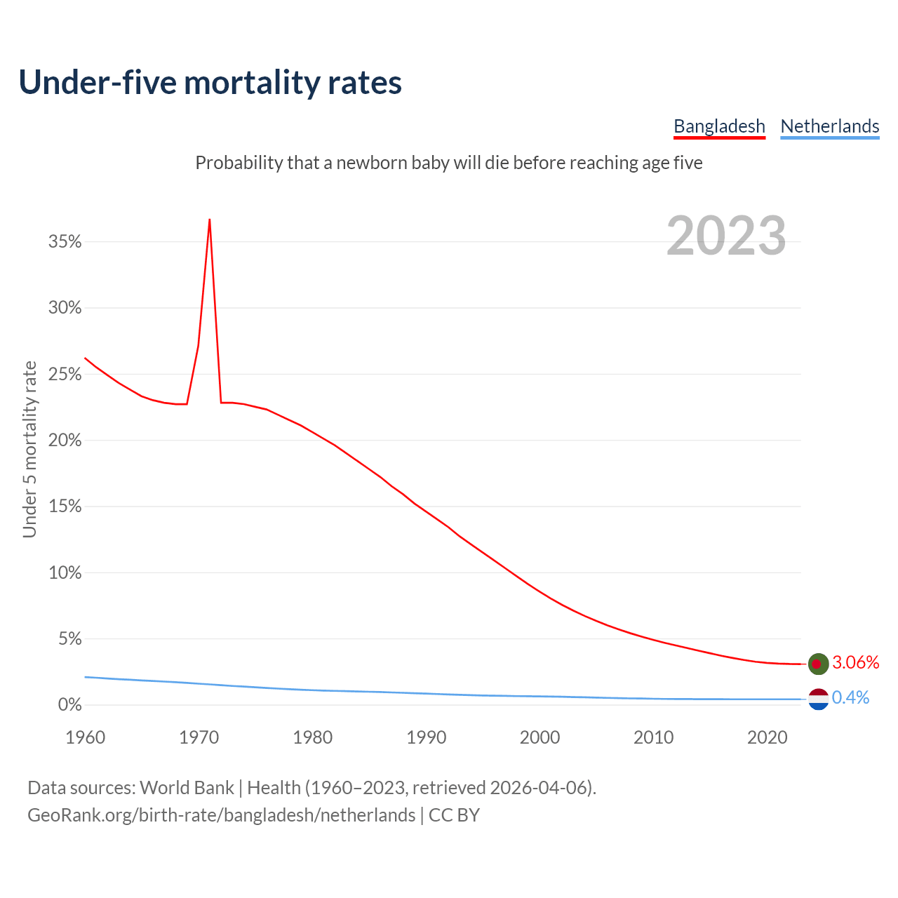 The chance that a newborn baby will die before reaching age five is 3.06% in Bangladesh and 0.4% in the Netherlands. Above is a chart with historical data on under-five mortality rates.