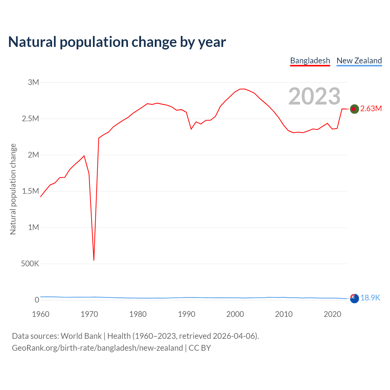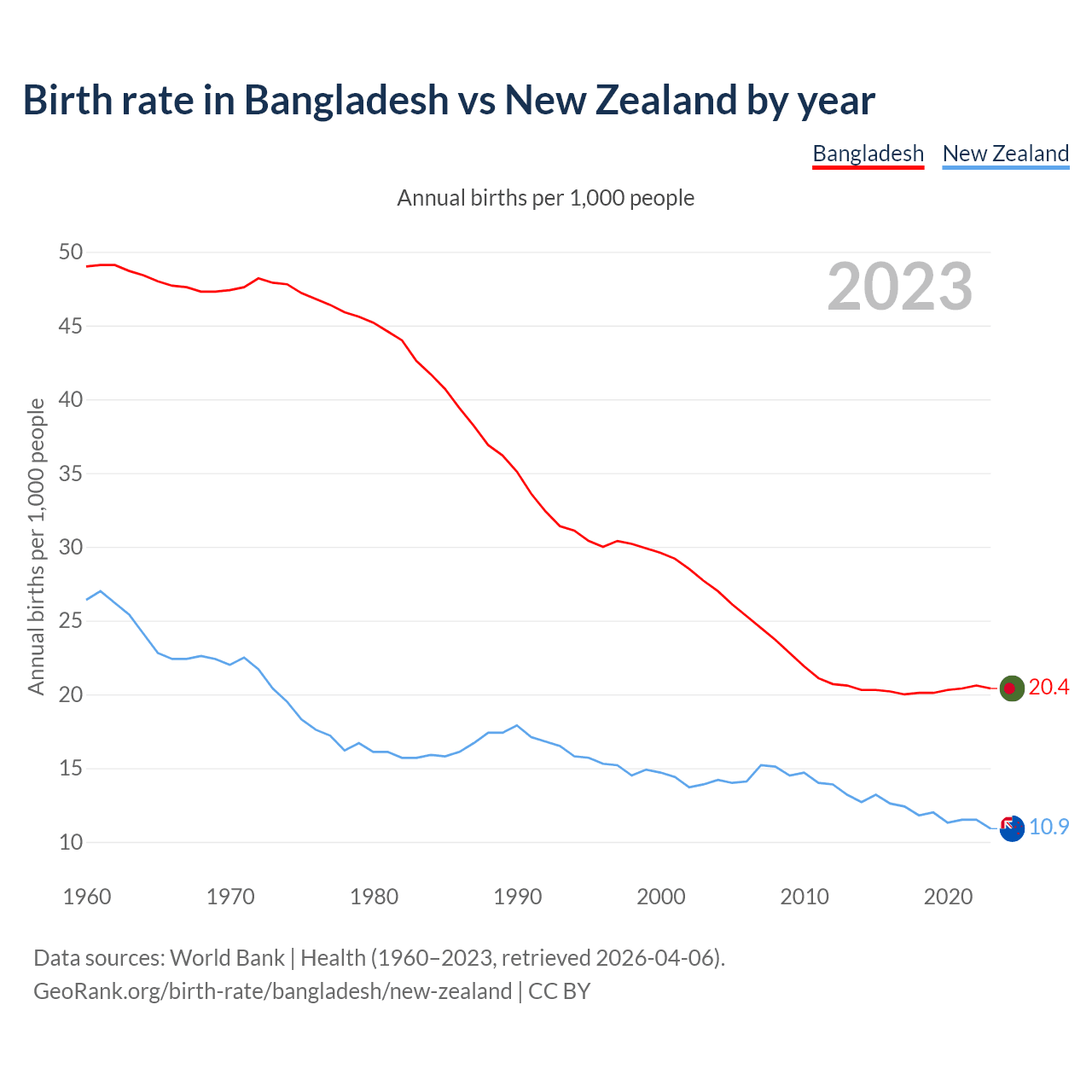 Bangladesh has an annual birth rate of 20.4 births per 1,000 people, compared to 10.9 for New Zealand. The average number of children a woman is expected to have during her lifetime — the fertility rate, is 2.16 in Bangladesh and 1.56 in New Zealand — 27.9% difference.