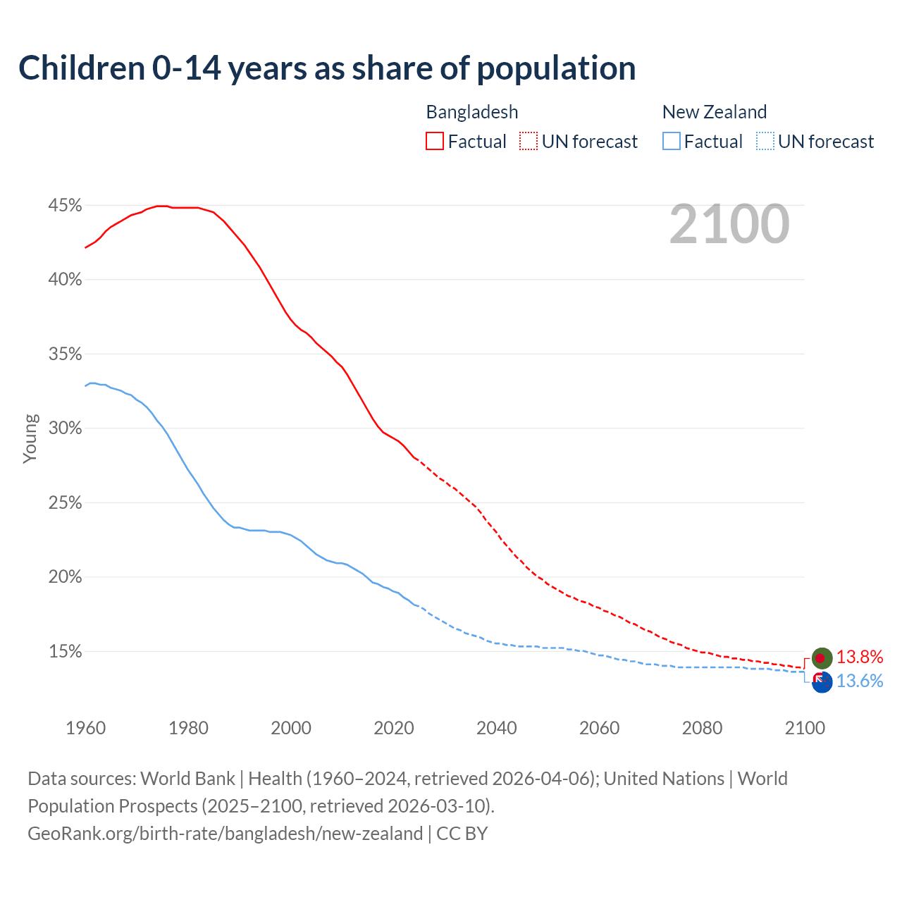 According to the latest available data on birth rates, the fertility rate in Bangladesh was 2.16 children per woman in 2023, compared to 1.56 in New Zealand in 2023. The replacement level is considered to be 2.1 children per woman.