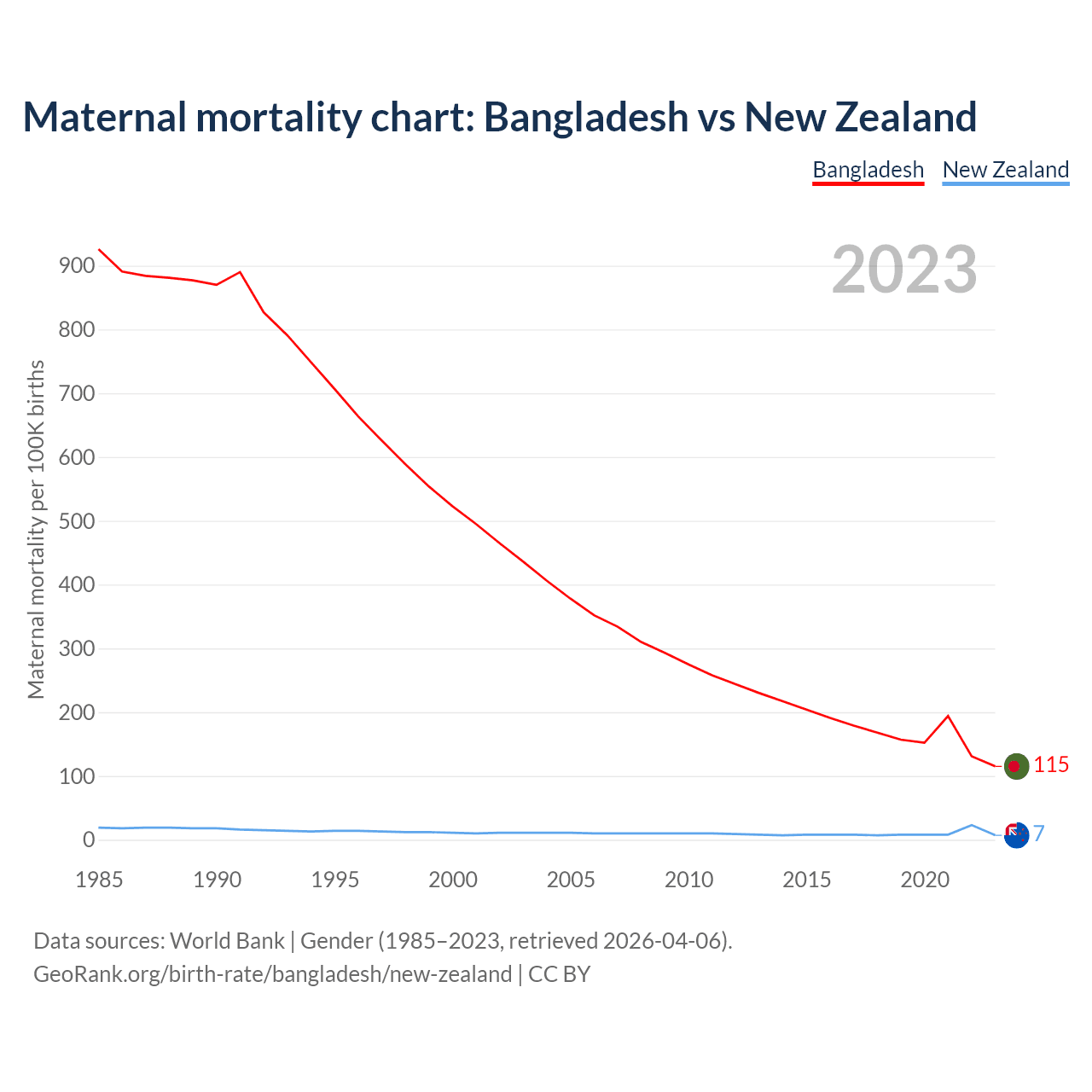 The maternal mortality rate, which is the probability of dying during childbirth or within 42 days of pregnancy termination, is 115 deaths per 100,000 live births in Bangladesh, compared to 7 deaths in New Zealand.