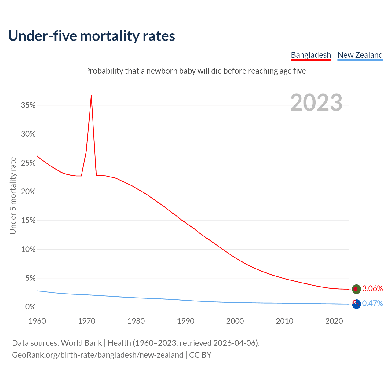 The chance that a newborn baby will die before reaching age five is 3.06% in Bangladesh and 0.47% in New Zealand. Above is a chart with historical data on under-five mortality rates.