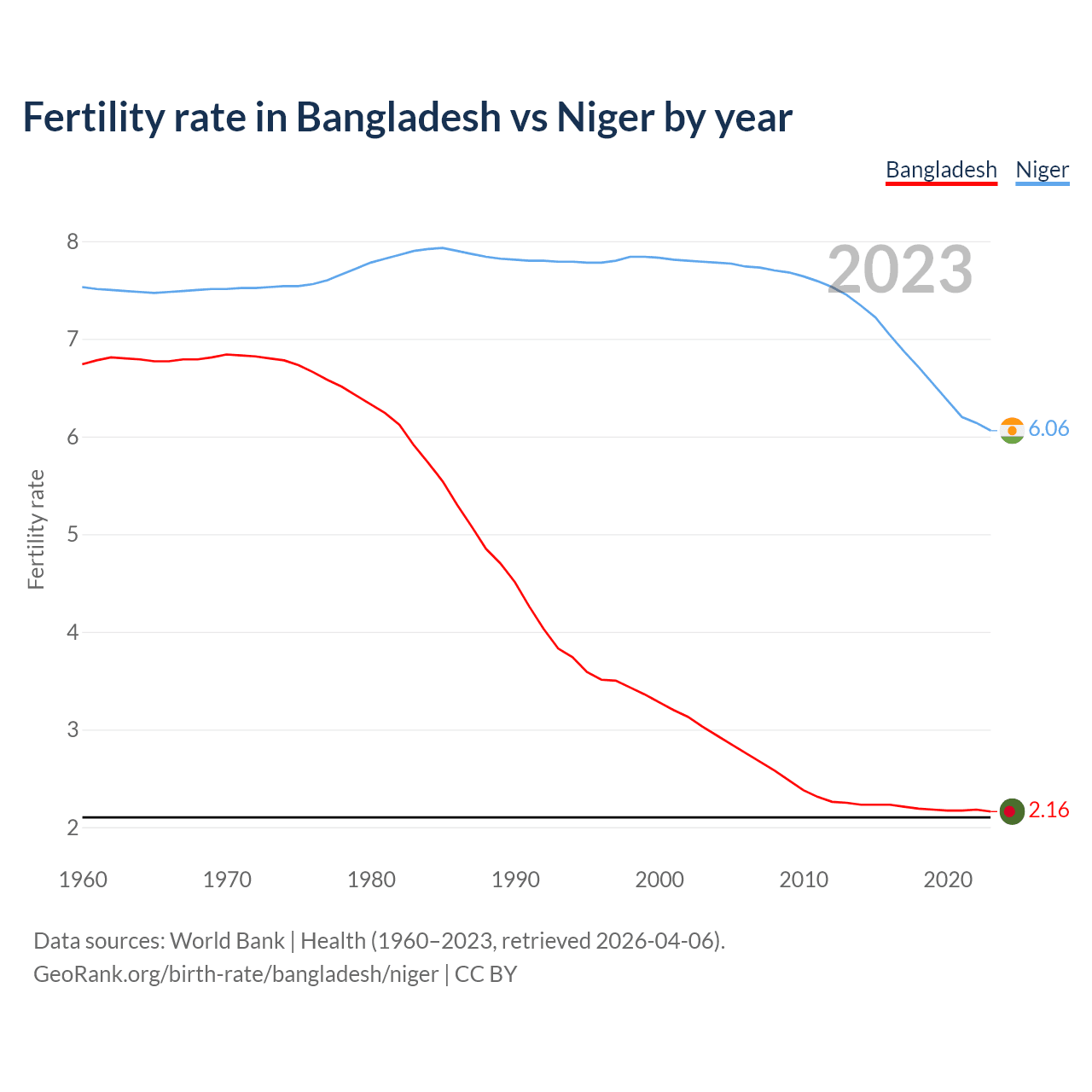 1960 vs 2023, the fertility rate has decreased by 67.9% in Bangladesh and by 19.5% in Niger — in 1960, it was 6.74 and 7.53, respectively.