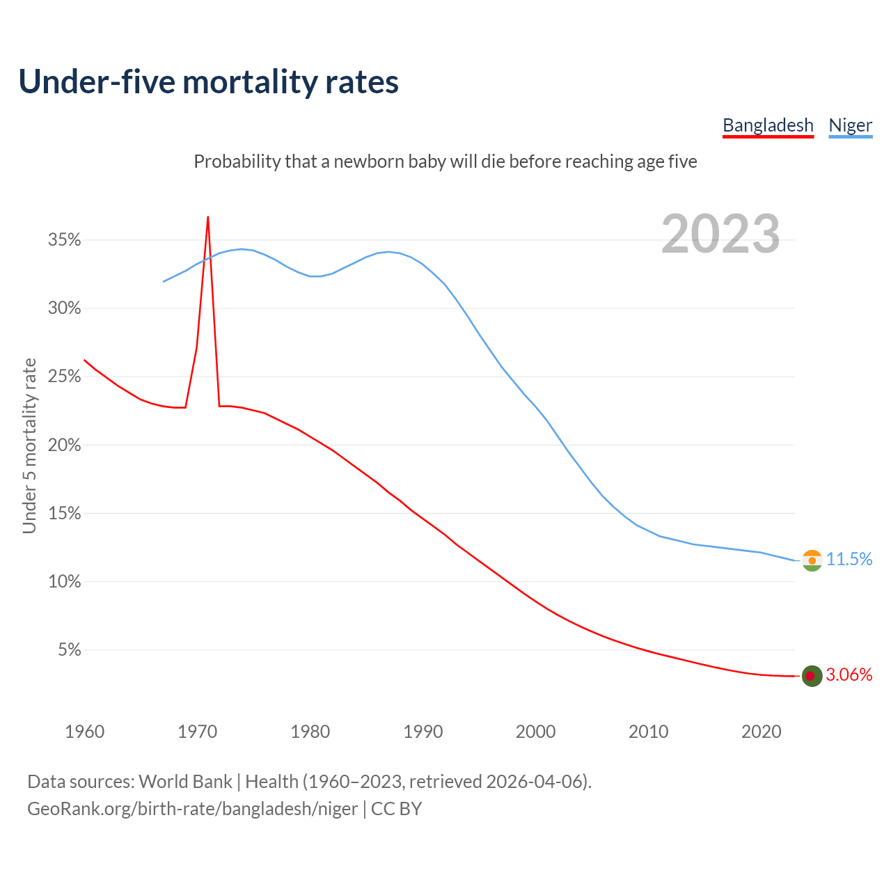 The chance that a newborn baby will die before reaching age five is 3.06% in Bangladesh and 11.5% in Niger. Above is a chart with historical data on under-five mortality rates.