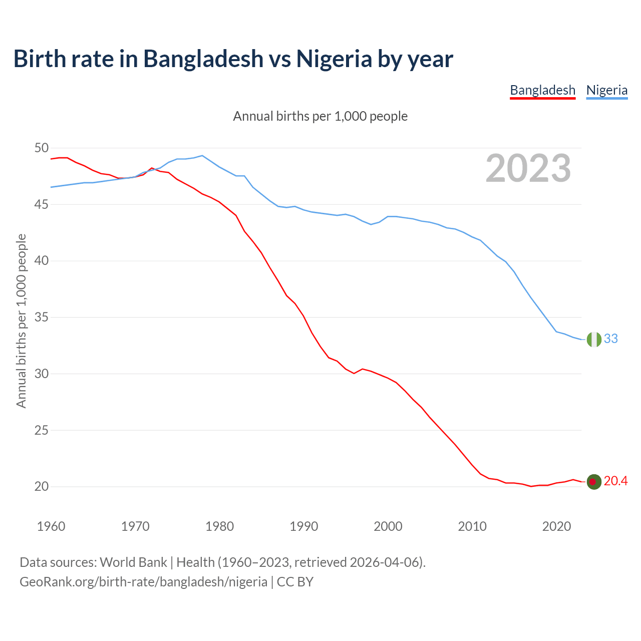 Bangladesh has an annual birth rate of 20.4 births per 1,000 people, compared to 33 for Nigeria. The average number of children a woman is expected to have during her lifetime — the fertility rate, is 2.16 in Bangladesh and 4.48 in Nigeria — 107.2% difference.