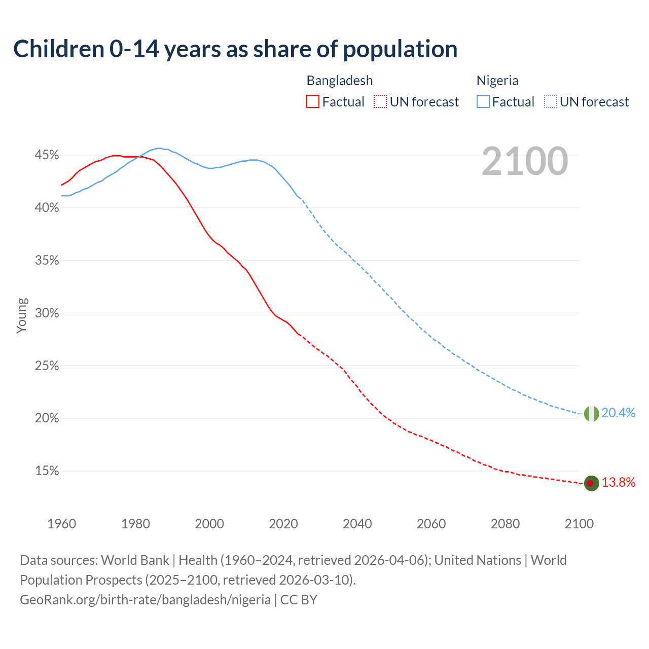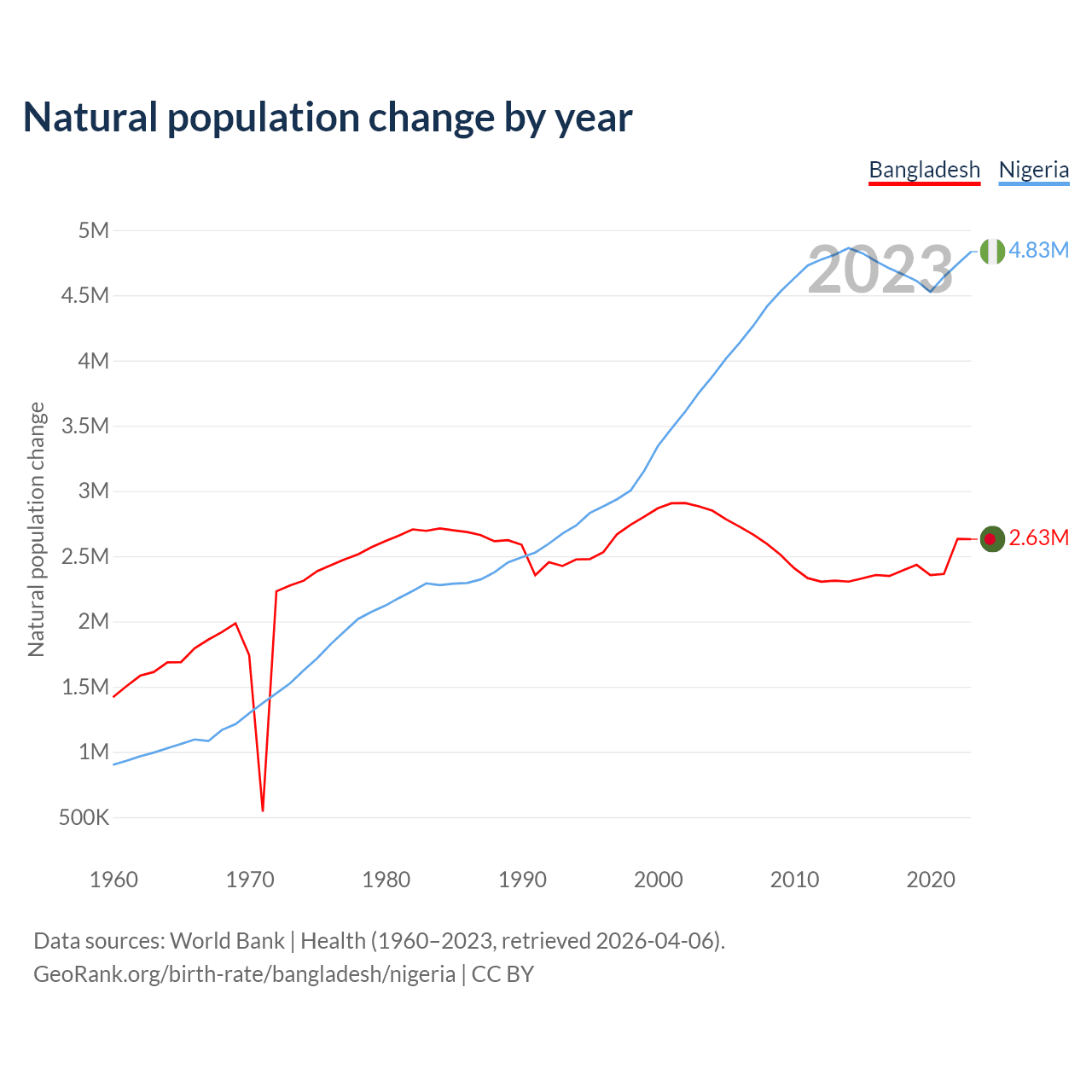 According to the latest available data on birth rates, the fertility rate in Bangladesh was 2.16 children per woman in 2023, compared to 4.48 in Nigeria in 2023. The replacement level is considered to be 2.1 children per woman.