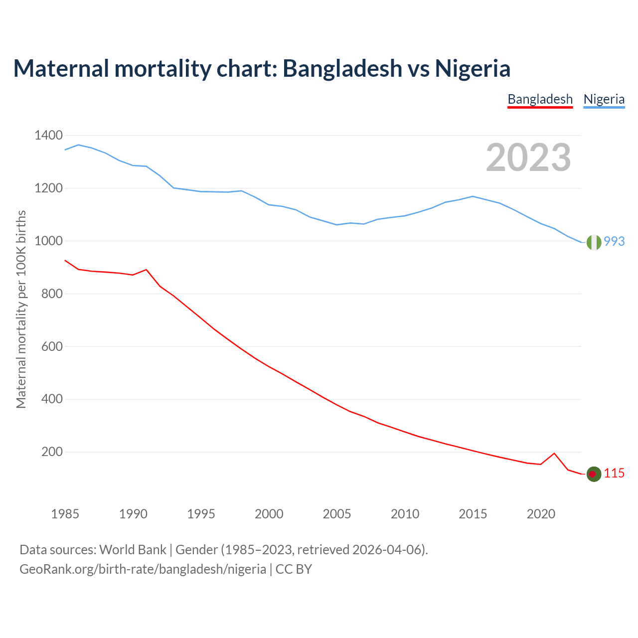 The maternal mortality rate, which is the probability of dying during childbirth or within 42 days of pregnancy termination, is 115 deaths per 100,000 live births in Bangladesh, compared to 993 deaths in Nigeria.