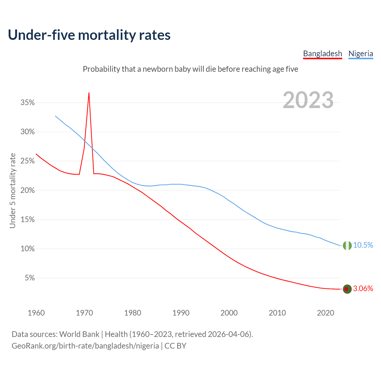 The chance that a newborn baby will die before reaching age five is 3.06% in Bangladesh and 10.5% in Nigeria. Above is a chart with historical data on under-five mortality rates.